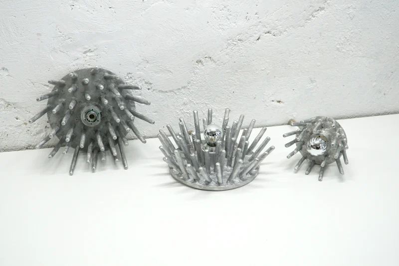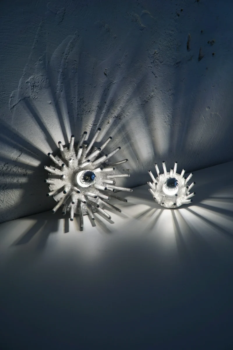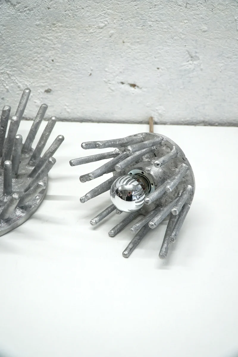 Foret is a work of exploration in cast aluminum. The object, whether a lamp or a shelf, is drawn into the sand mould by hand using a drill. It’s a return to slowness, where randomness has a real place in the object’s purpose. Each lamp has a different number of prongs, each of slightly varying length, due to the manufacturing process. The most appropriate way to use and install the lamp is either directly on a piece of furniture, or fixed as a wall lamp.