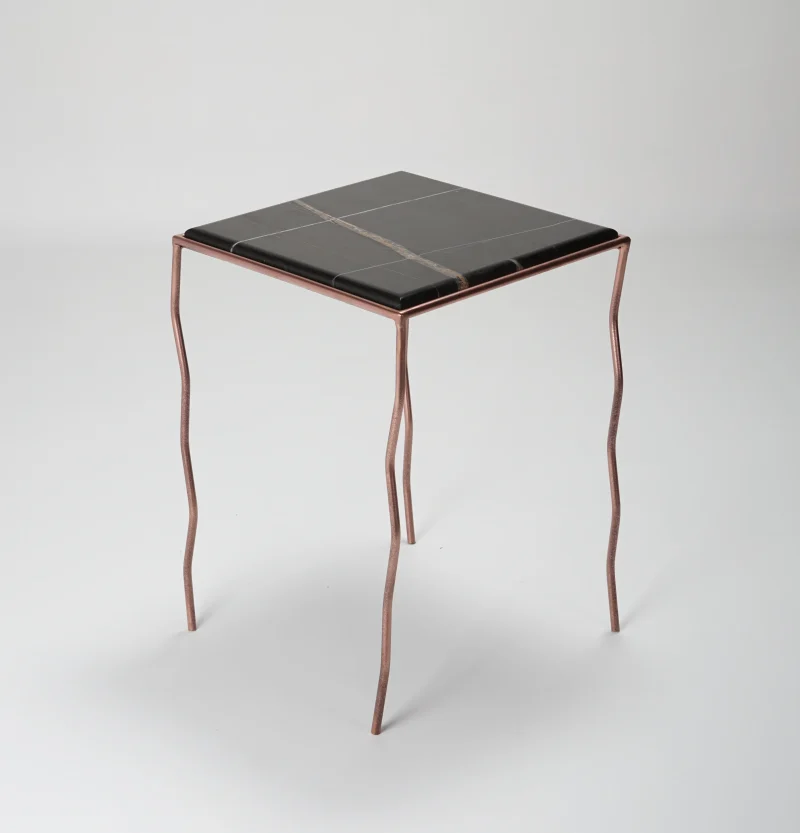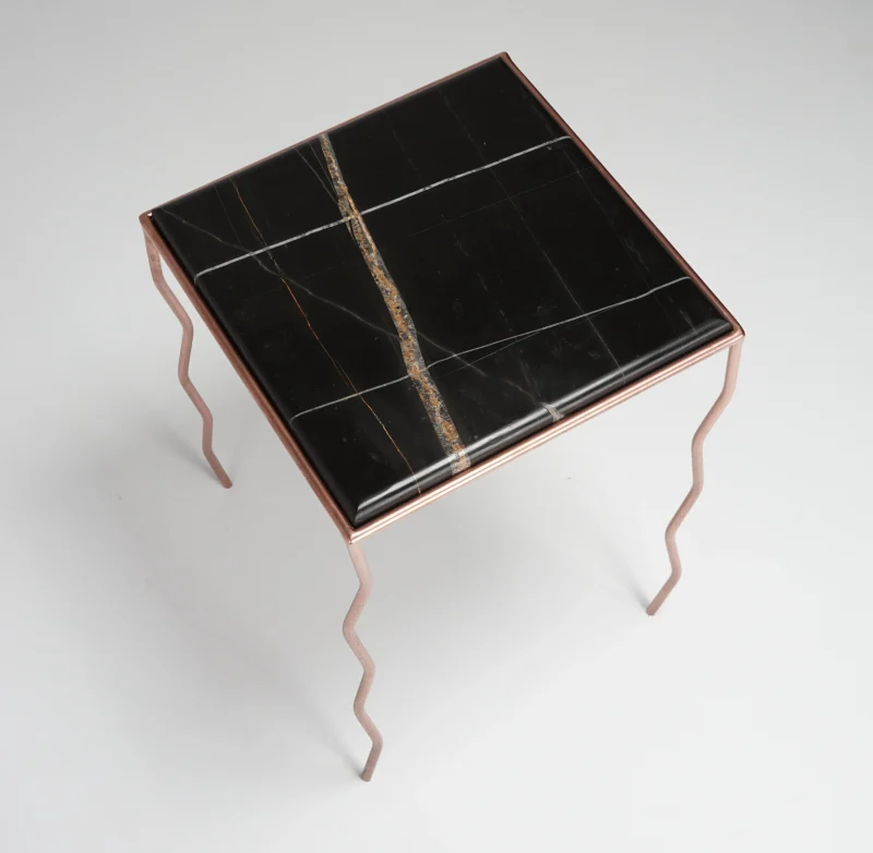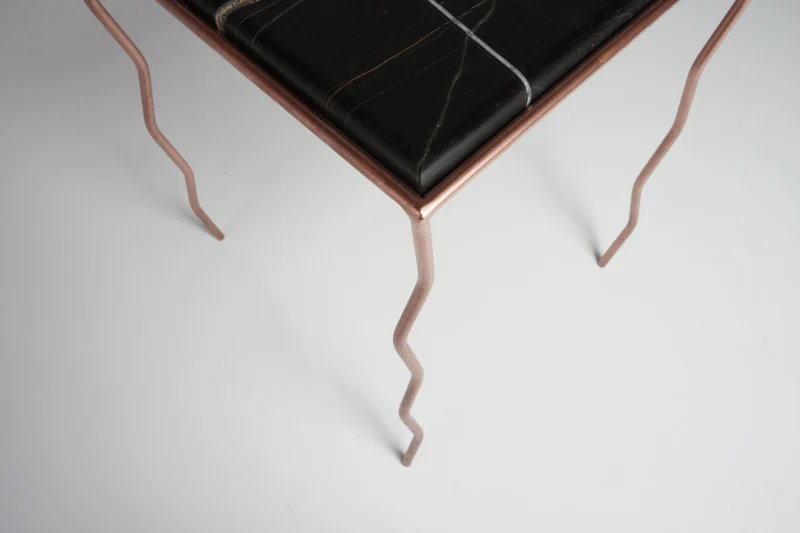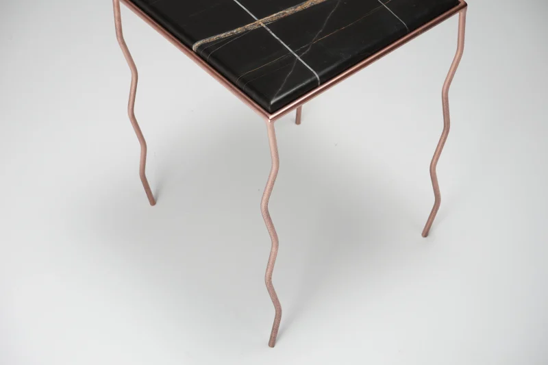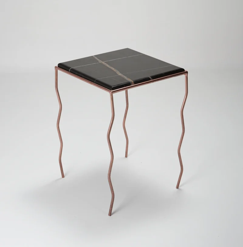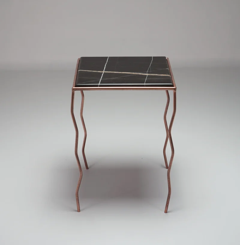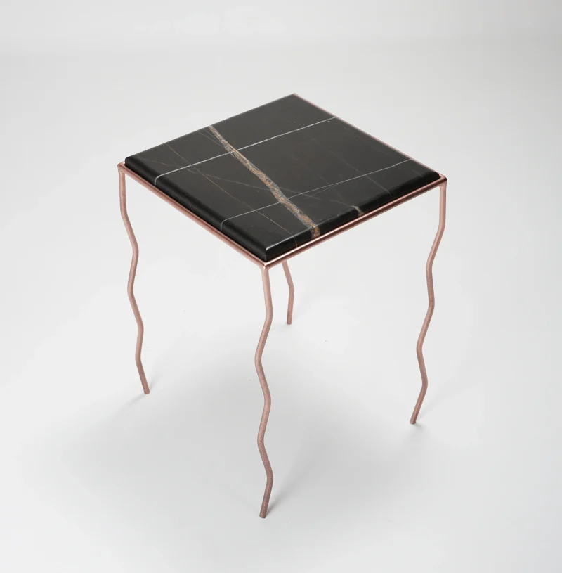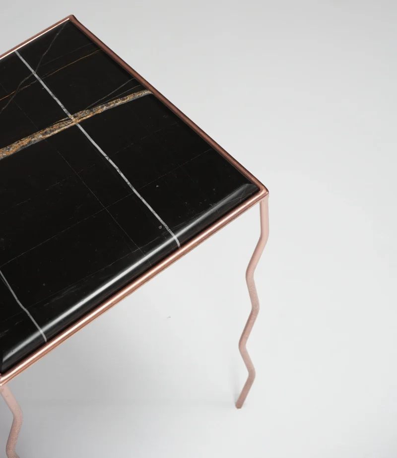 The brushed Noir marble top, with its warm and deep veins, meets a hand-crafted iron structure with wavy legs and a rose-chrome finish, giving the metal a fluid and almost biological character.