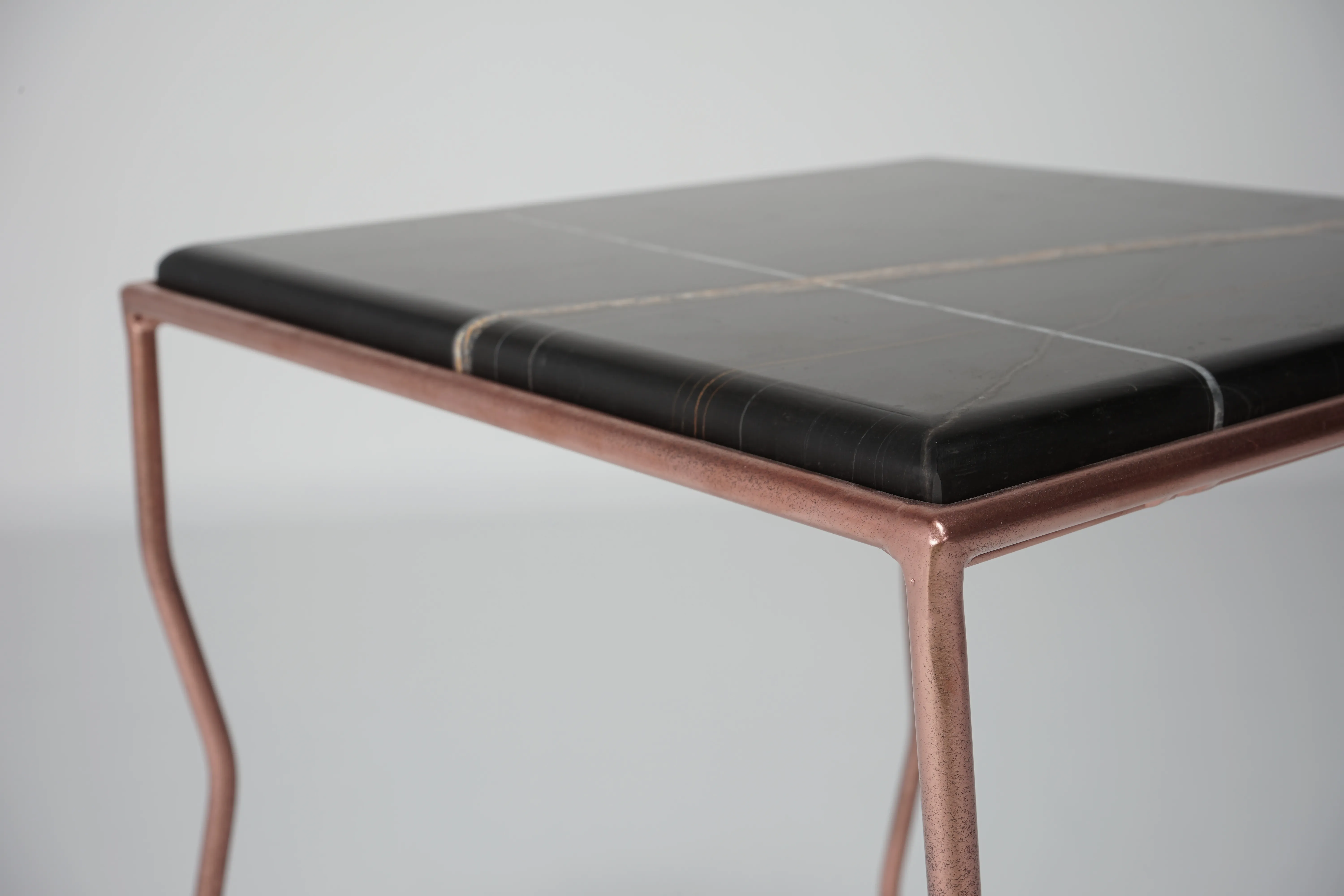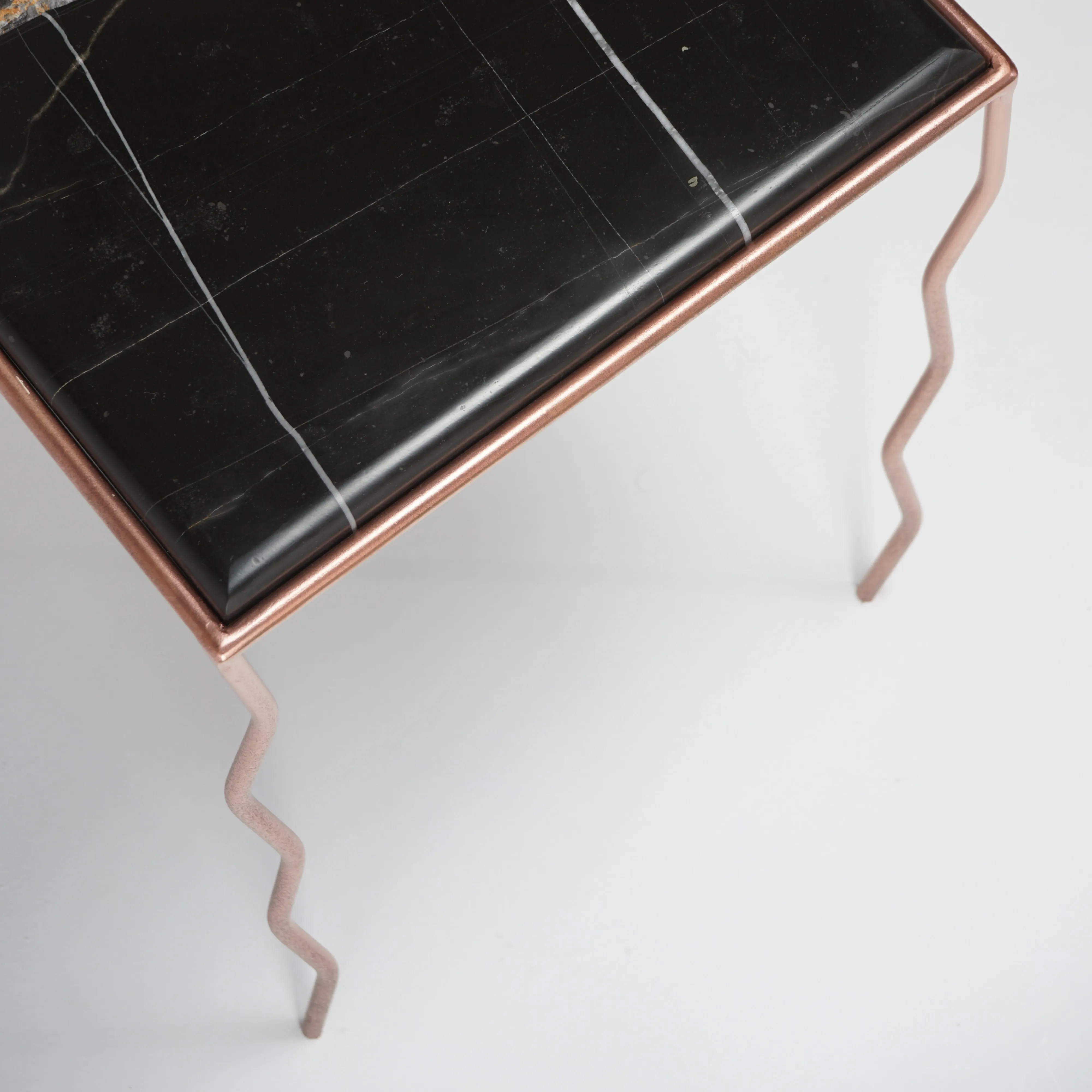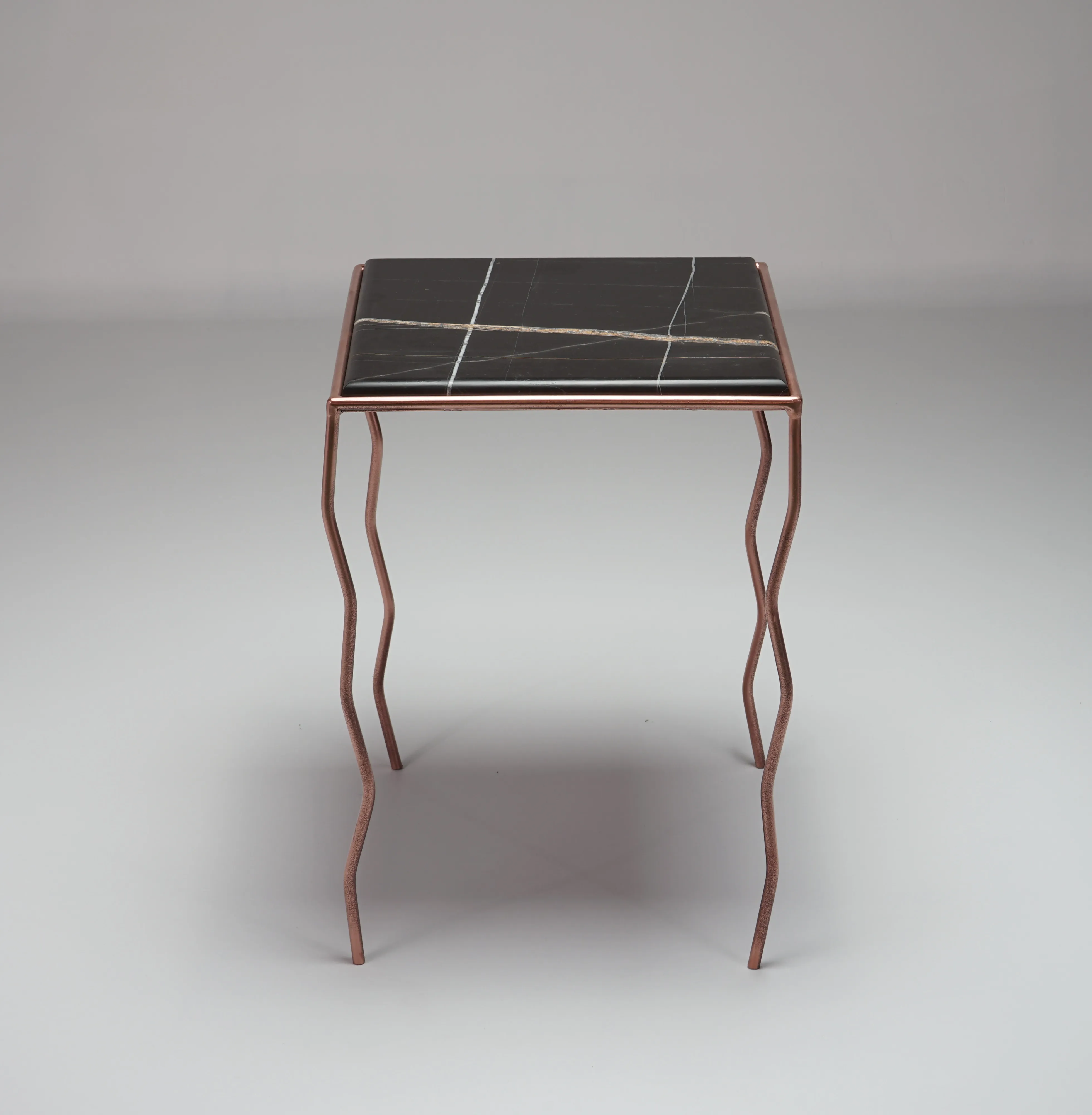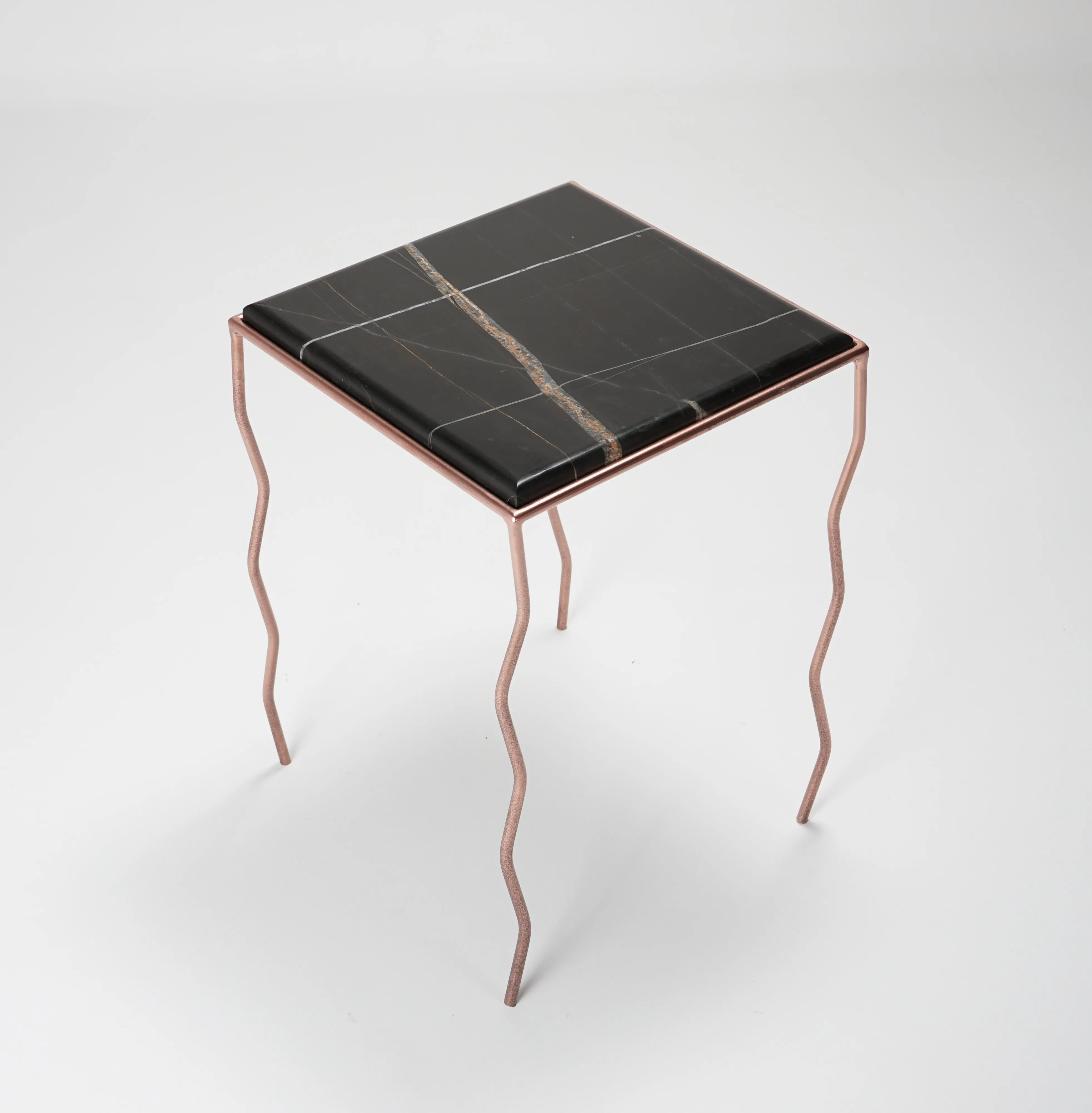 The brushed Noir marble top, with its warm and deep veins, meets a hand-crafted iron structure with wavy legs and a rose-chrome finish, giving the metal a fluid and almost biological character.