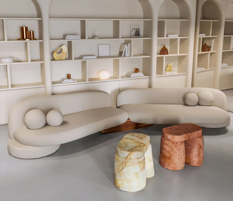 The composition is completed by a minimalist volumetric form of the tabletop.