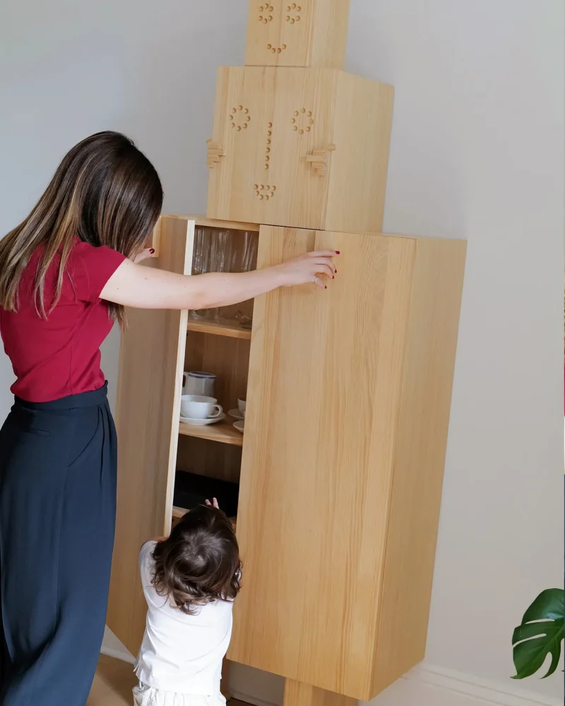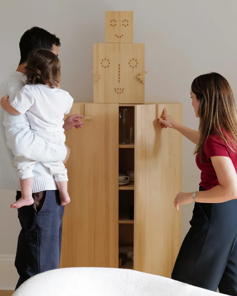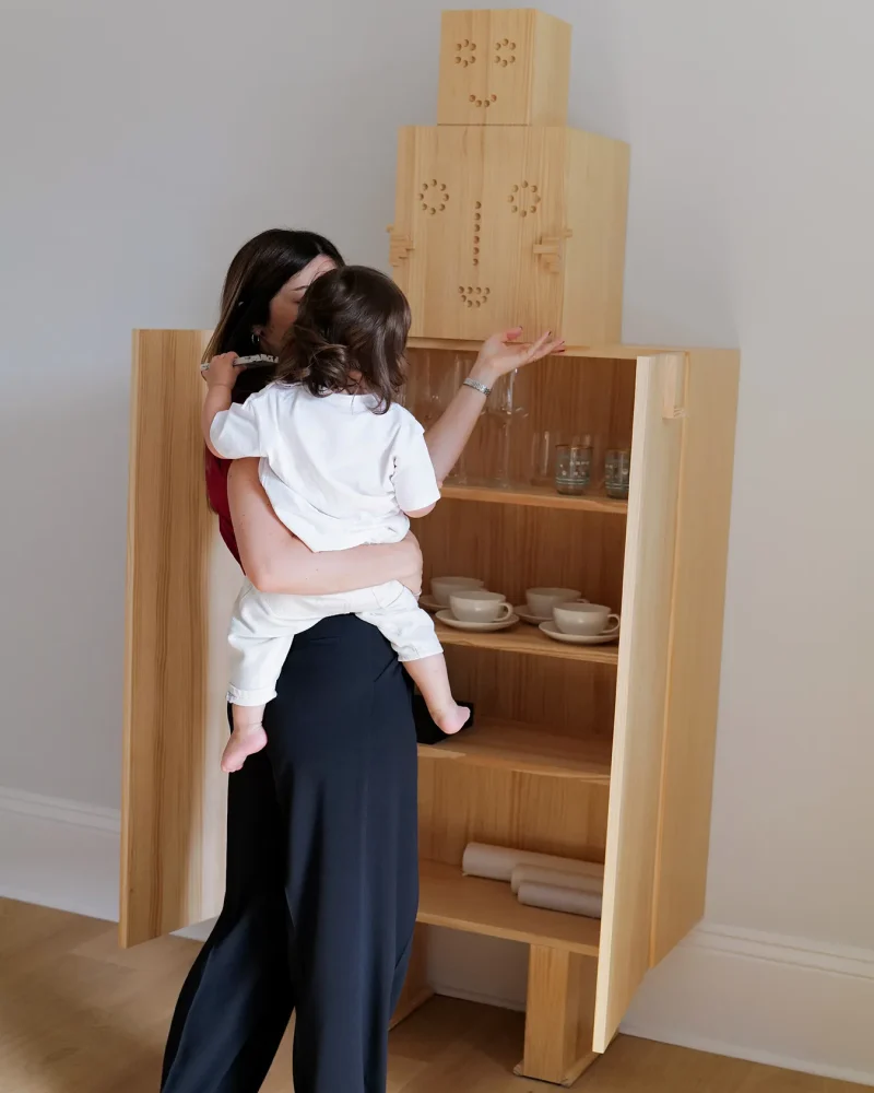 This cabinet is part of the Pino Collection, a series within the Family Project that continues the exploration of portraiture through furniture and furniture friends. The piece embodies a sense of balance and relationship, where distinct proportions come together in a composition of volumes and subtle figurative elements.