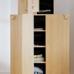 Inside, adjustable shelves provide adaptable storage while maintaining the clarity of the outer silhouette. Each detail has been designed to preserve the coherence of the whole, allowing the cabinet to serve both as a practical container and as a sculptural presence within a space.