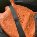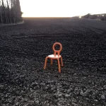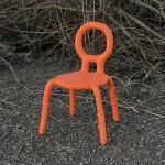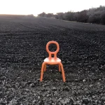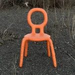 Upcycled, orange, fully functional, handmade chair by David Čáp with a rounded shape made of shredded paper. Despite the unconventional material, it has sufficient load capacity (100 kg) and is easy to wash.