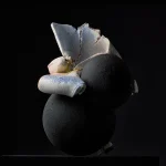 This ceramic sculpture is a striking decorative piece that blends the raw beauty of high-temperature black clay with the elegance of glazed porcelain.