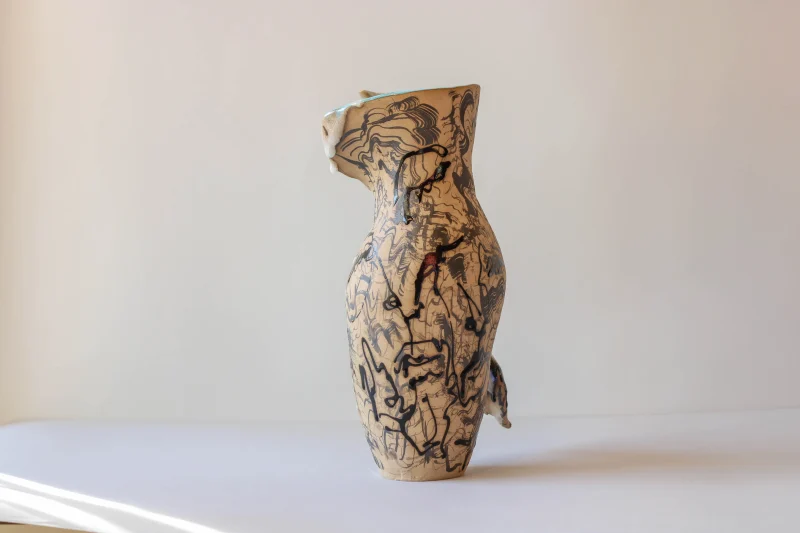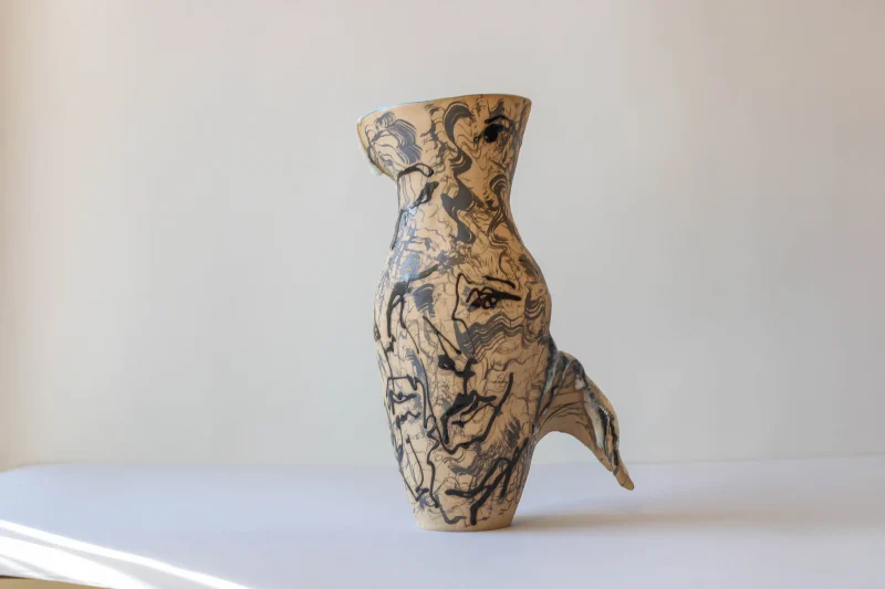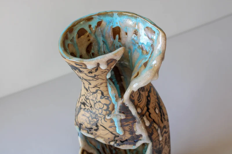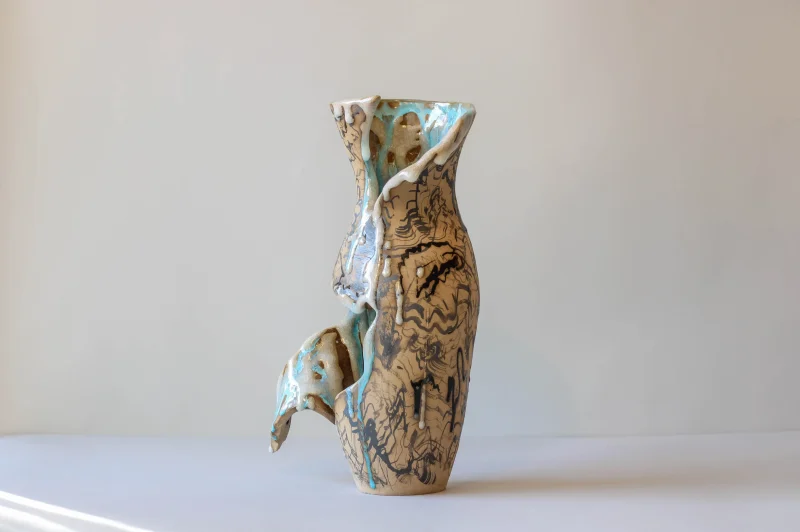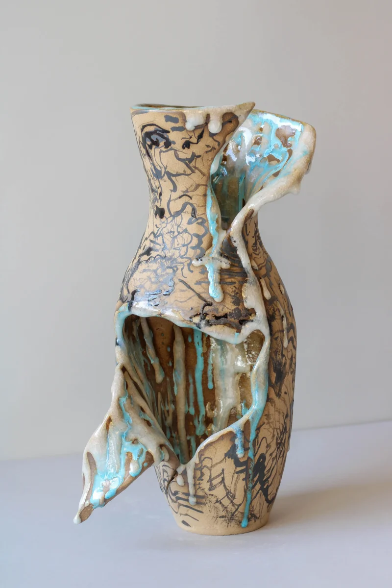A singular stoneware sculpture by Vale Ro, accentuated with personal formulated glazes designed to evoke the transparency and fragility. This piece was intentionally fractured during the building process in order to expose fissures and hidden interiors, offering a glimpse into the heart of the creation process. Inspired by the delicate balance between creation and destruction, a very often synergy when working with clay. This vase celebrates the beauty of imperfection and the stories told by the unseen.