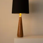Natural Parota wood base with matte finish, hand-forged brass parts, and sturdy lampshade with fiberglass and linen.