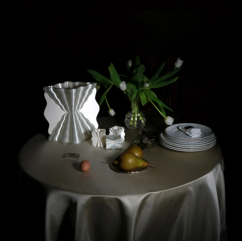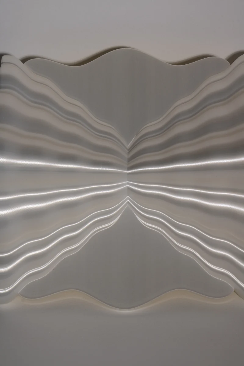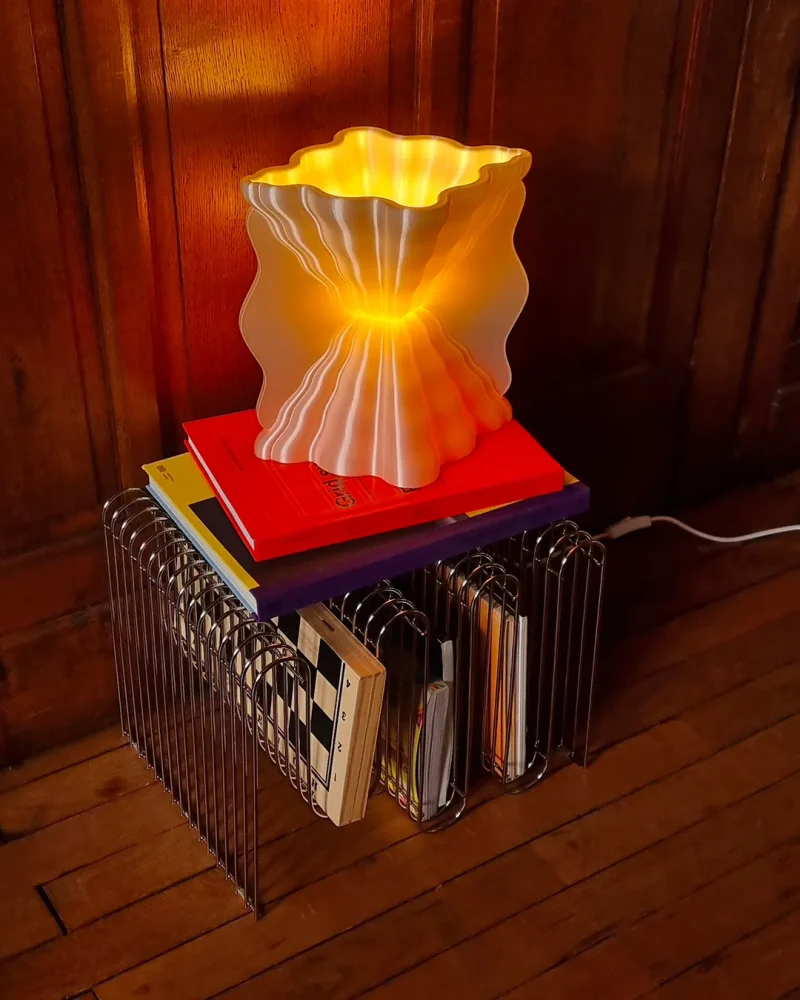 This lamp pays homage to the classic shapes of Greco-Roman cups, associated with the wavy imprints that the sea leaves on the sand as it recedes. Its pearlescent appearance captures and reflects light, even when turned off, giving it a subtle and elegant presence. Each piece is made in France, printed with biosourced material.