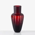 The modern silhouette of the vase in an atypical color alludes to the classic Czech tradition of glass hand cutting difficult patterns into czech crystal glass.