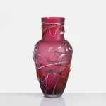 Each vase is handmade, mouth-blown into a wooden mold, hand-cut, sanded, matted to a velvety finish and hot glass decorated.