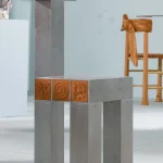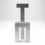 Its brutalist aluminum frame is intentionally uninviting, impractical — almost defiant in its lack of comfort. Breaking this constructivist severity, eight low-relief inserts in oak or ceramic introduce a tactile, nostalgic softness.