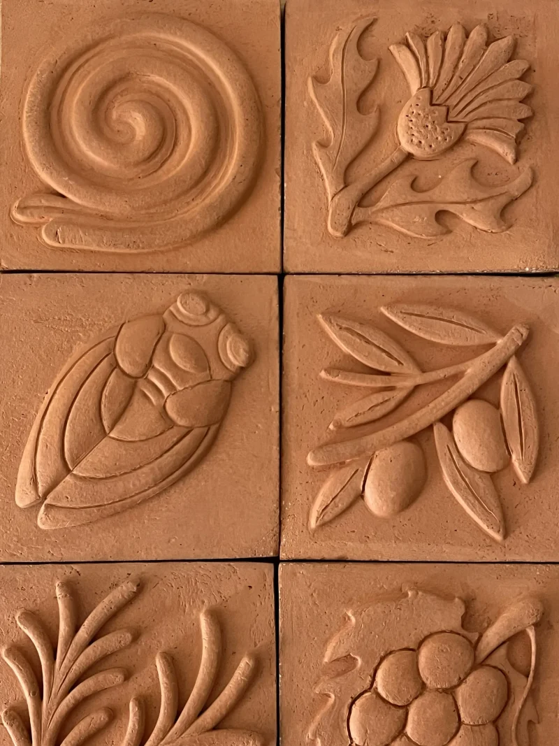 Each one bears a motif drawn from the decorative vocabulary of Provence — olive branches, lavender, grapes, cicadas… patterns once omnipresent in local artisanal furniture, textiles, and objects.