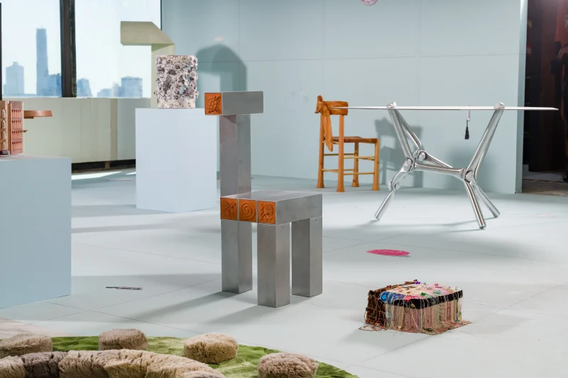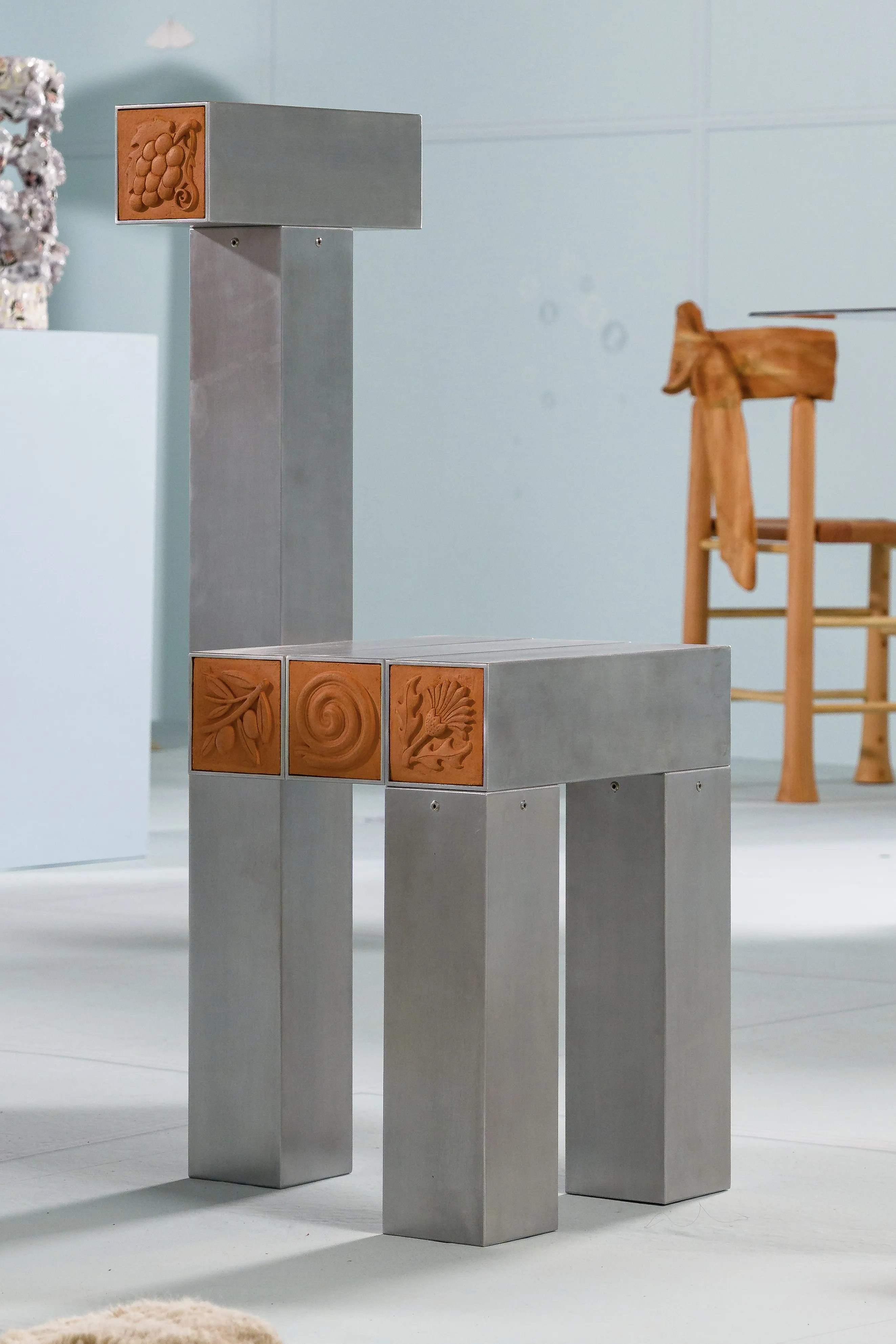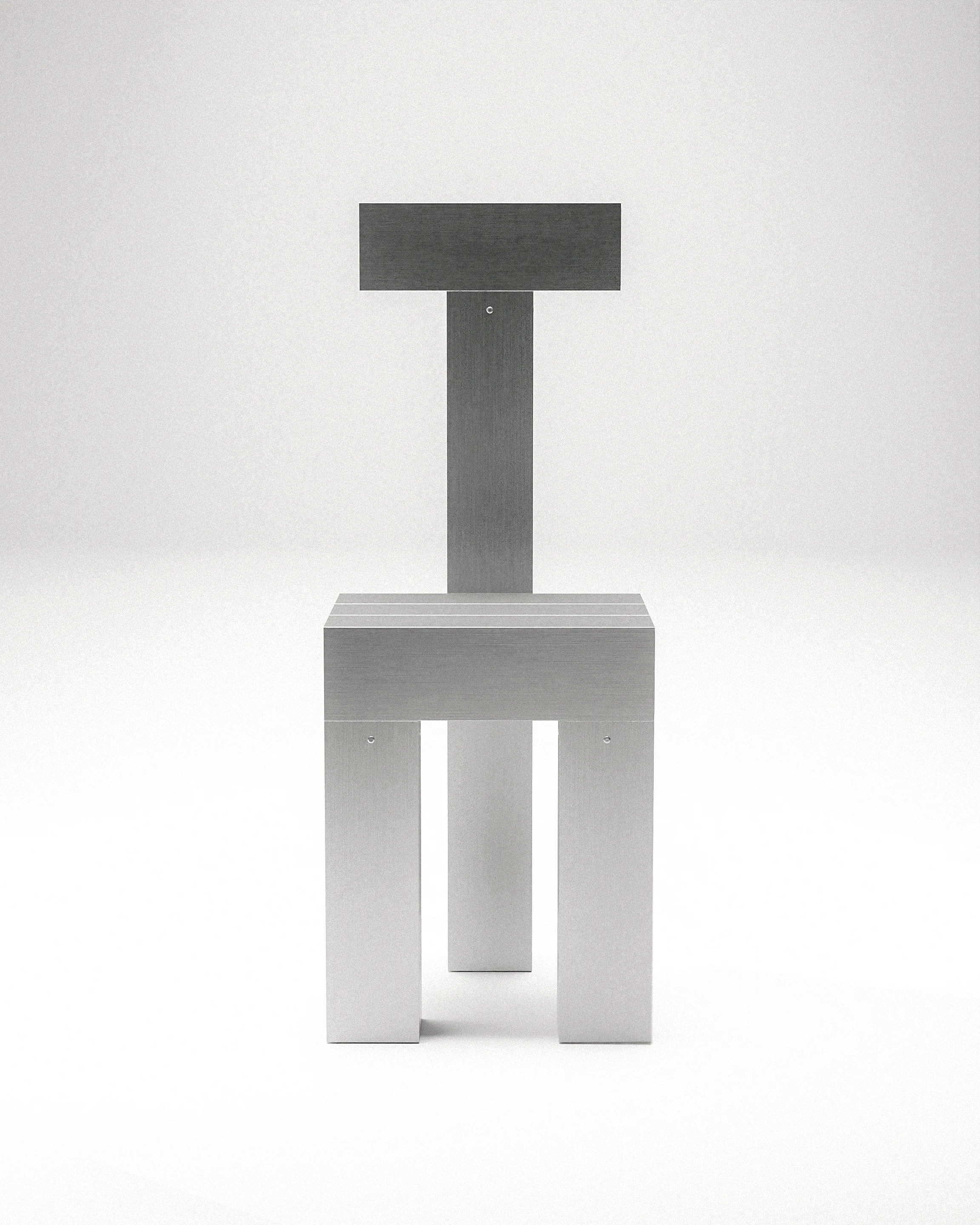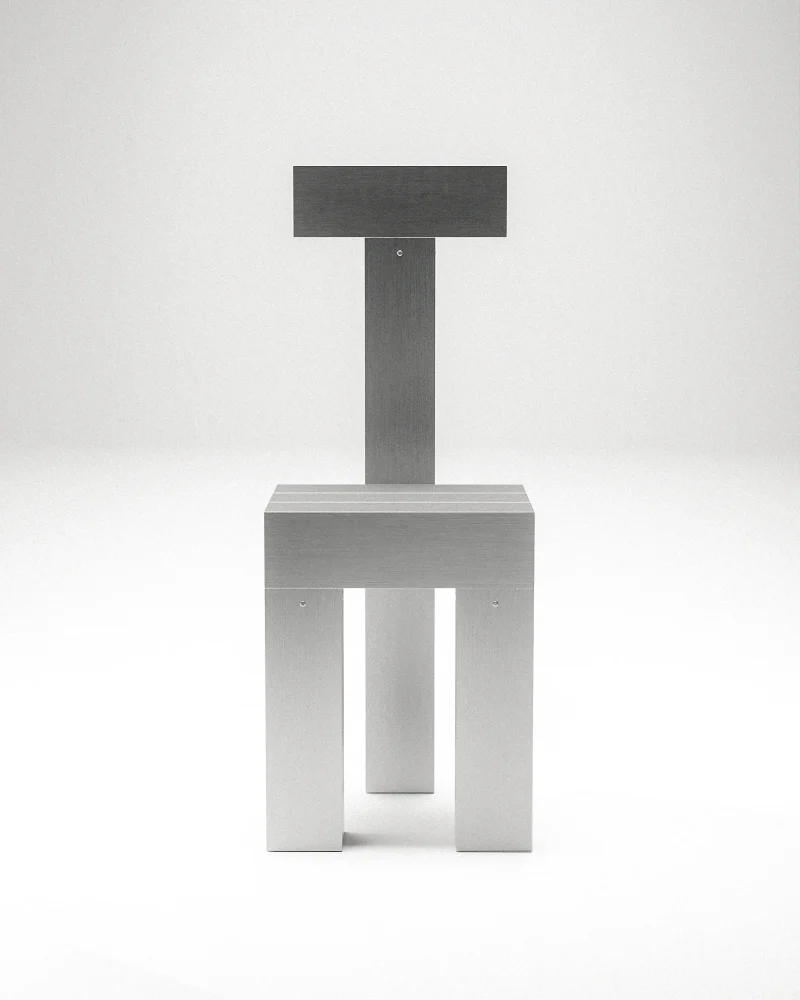 Its brutalist aluminum frame is intentionally uninviting, impractical — almost defiant in its lack of comfort. Breaking this constructivist severity, eight low-relief inserts in oak or ceramic introduce a tactile, nostalgic softness.