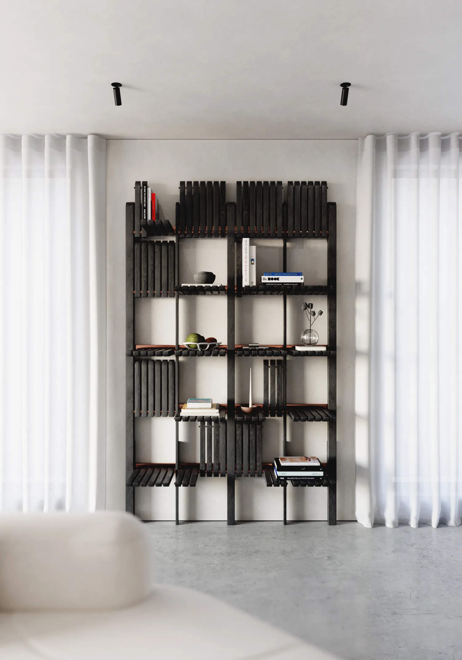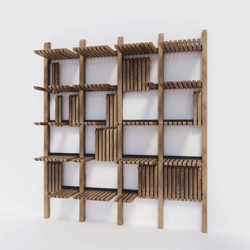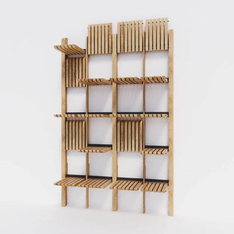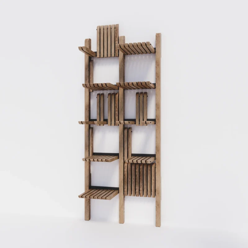 The shelves are made of solid ash blades and can be operated with a single touch, a system of magnets allowing them to stay in a vertical position. Lowered or folded as needed, they come in five widths and two depths. GATE is memorable because of its adaptability, its powerful character and its sharp aesthetics, making it a striking element in every interior.