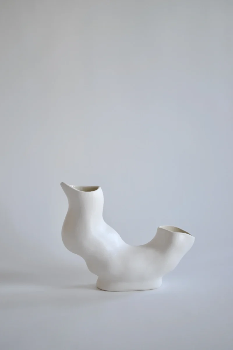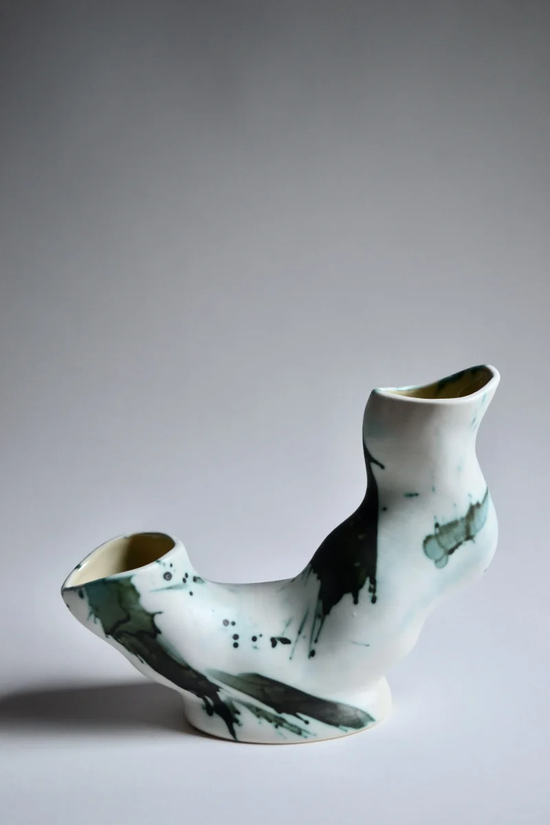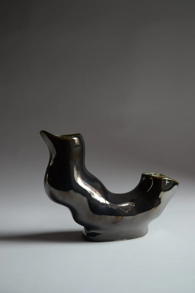 Genie is a hazy form; the pattern of heat at a distance made solid. Created and repurposed from a broken “O” vessel, Genie is erosion as creation– recovery of bisque mishaps to make an intriguing, sylphy shape. As two winding sides of a foggy, wooded valley or the clouds of mist created by the force of a river, Genie rises upwards with charming allure.