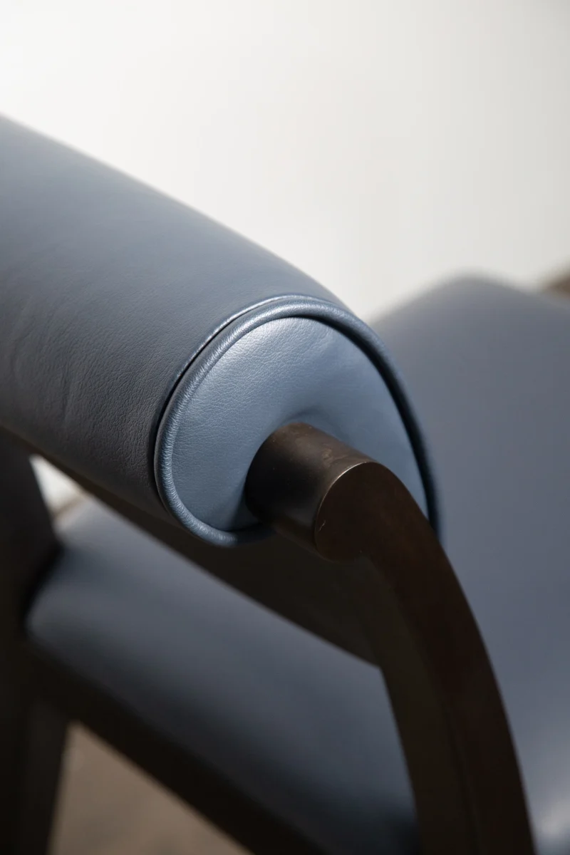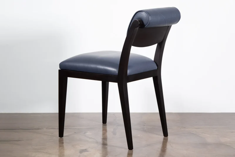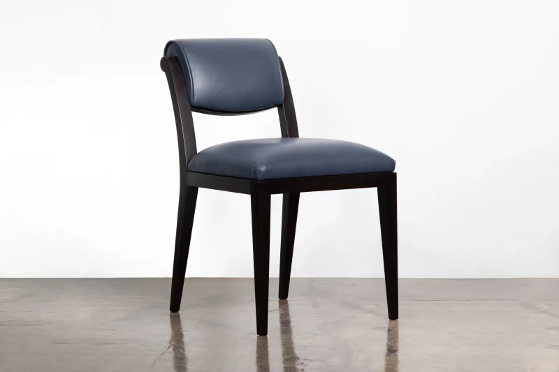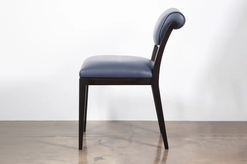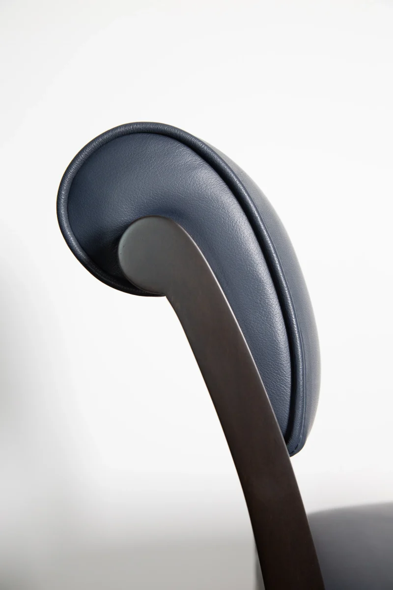 The Gianni dining chair by Costantini Design borrows cues from the early-20th century Art Deco masters and features a light frame with a scrolled back. Shown in ebonized Argentine Rosewood and leather.