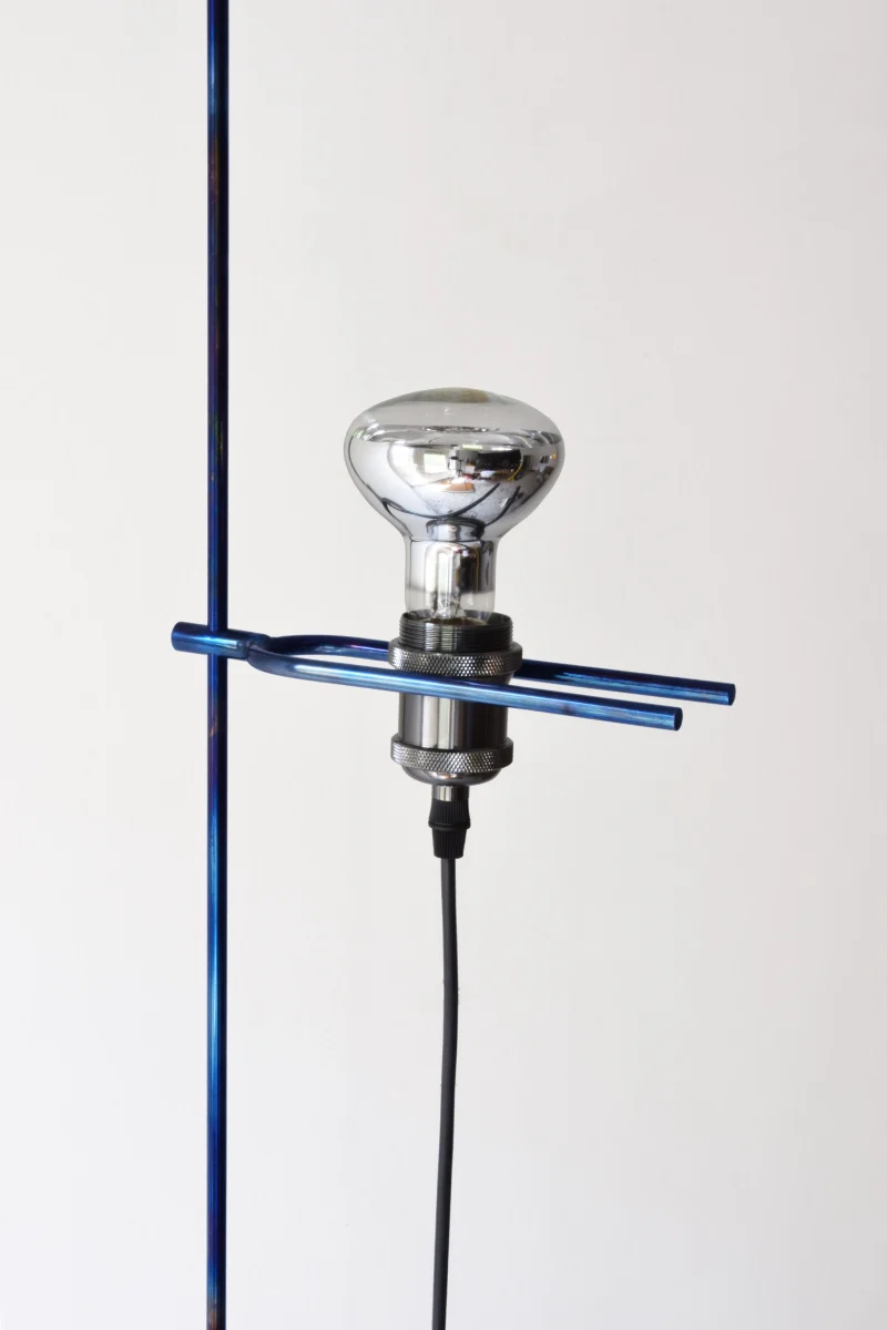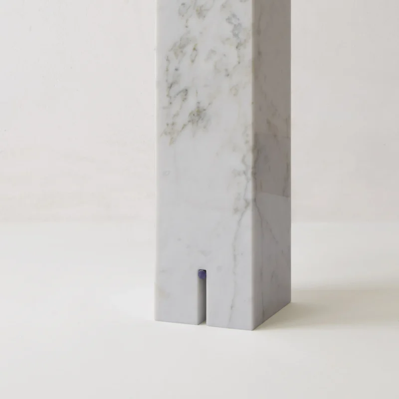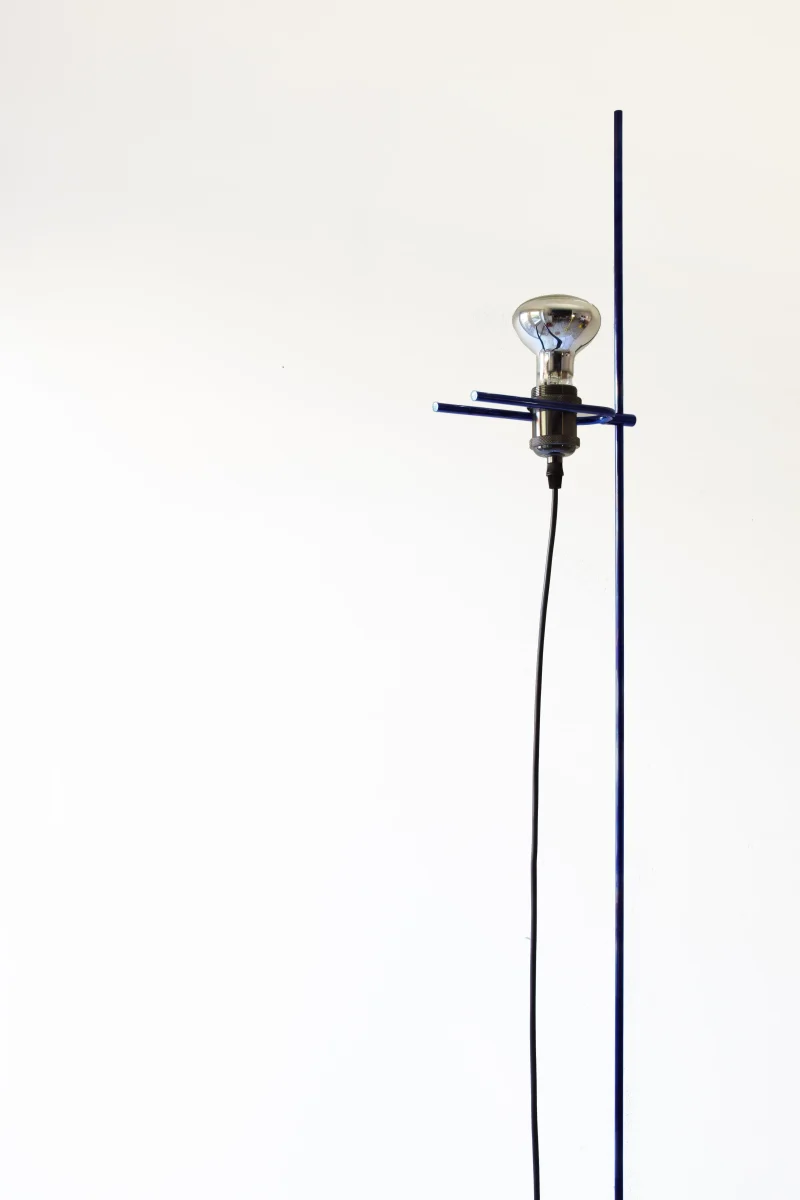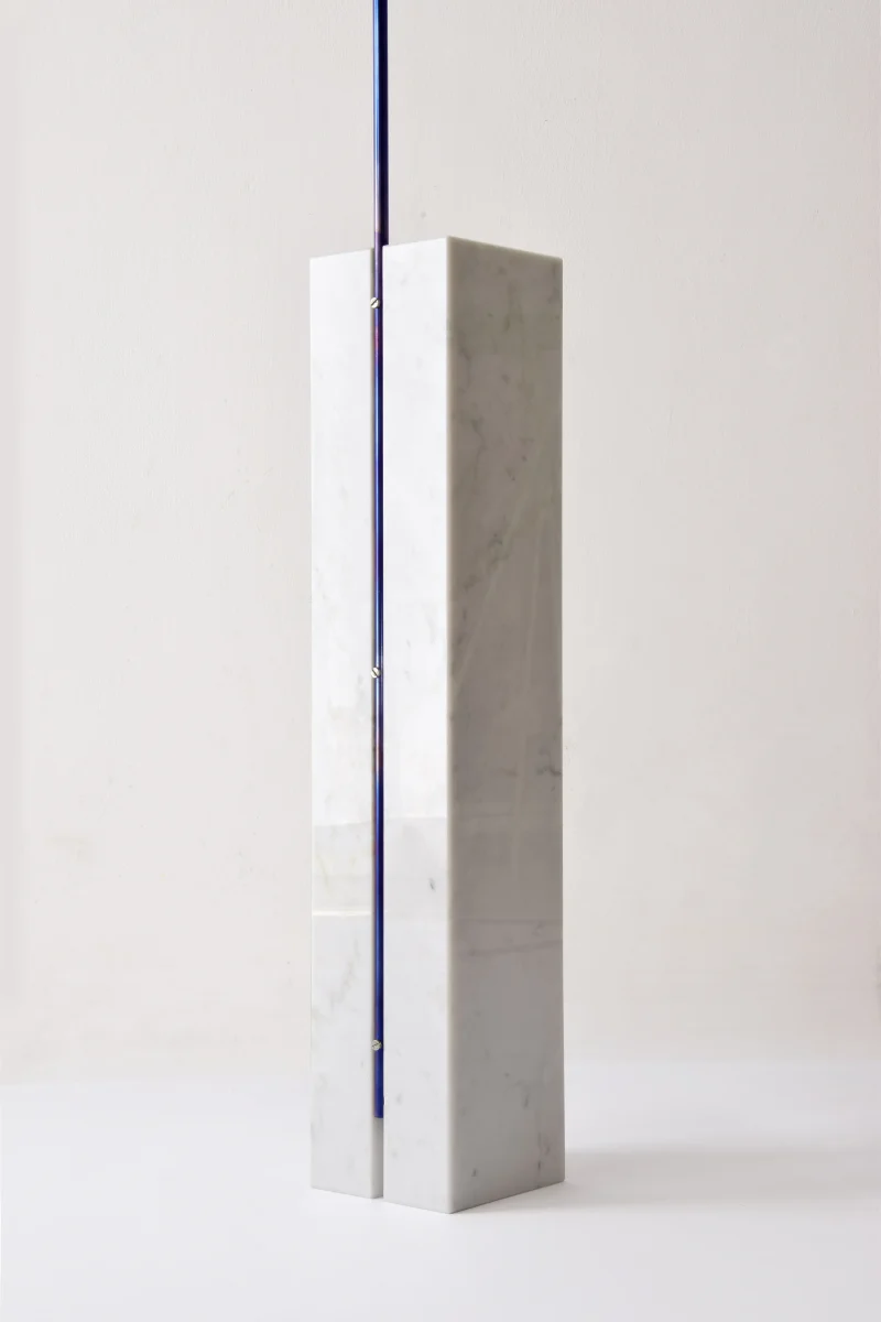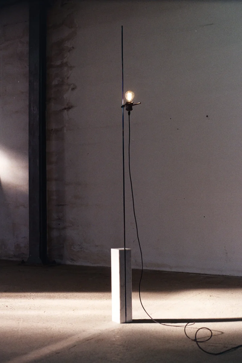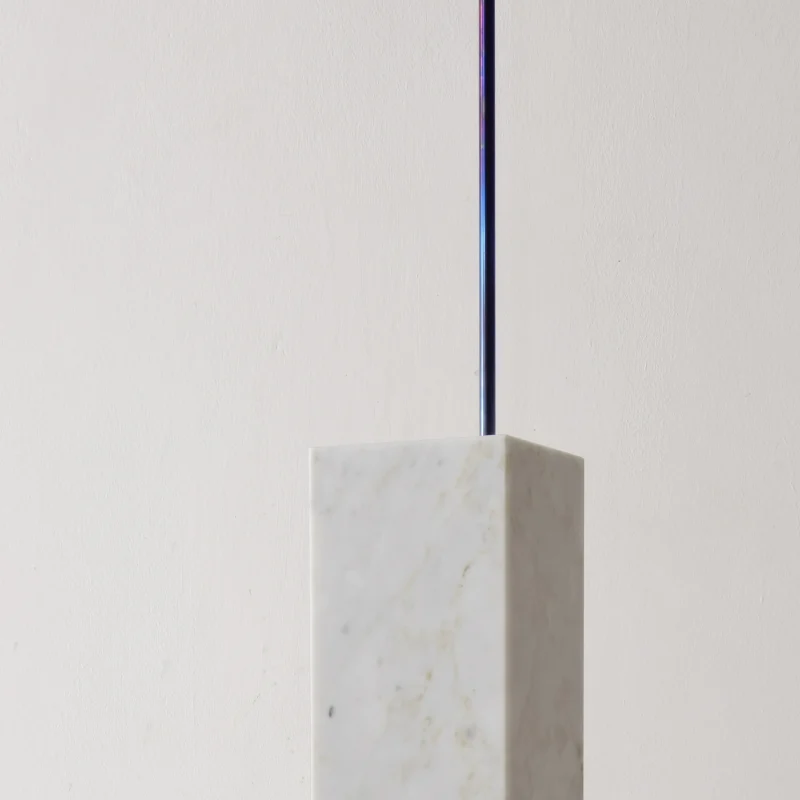 The project is made up of a few simple elements, a regular base, a rod, a light bulb, and an electric cable, which establish a dialectical relationship often based on contrast. For example between the sinuous fluidity of the wire and the perfect straightness of the rod or the marble edges, or between the heaviness of the base and the lightness of the metal part. The whole project is based on balance.
