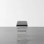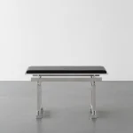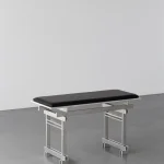 Gio Bench is part of “ALUCUTS” (2021 – 2023) furniture series, showcasing simple yet sturdy bolted assemblies of 12mm squared cuts of aluminium plates. The cuts are organized empirically until the piece reveals itself. Craft is kept to its bare minimum: the shiny edges are scarred by the blade, and contrast with the brushed finish; countersunk Allen bolts details underline the connections.