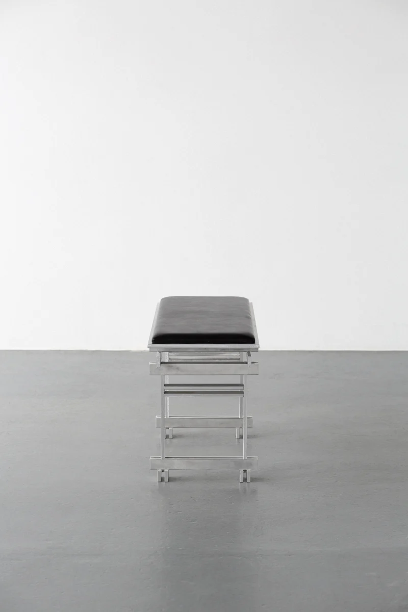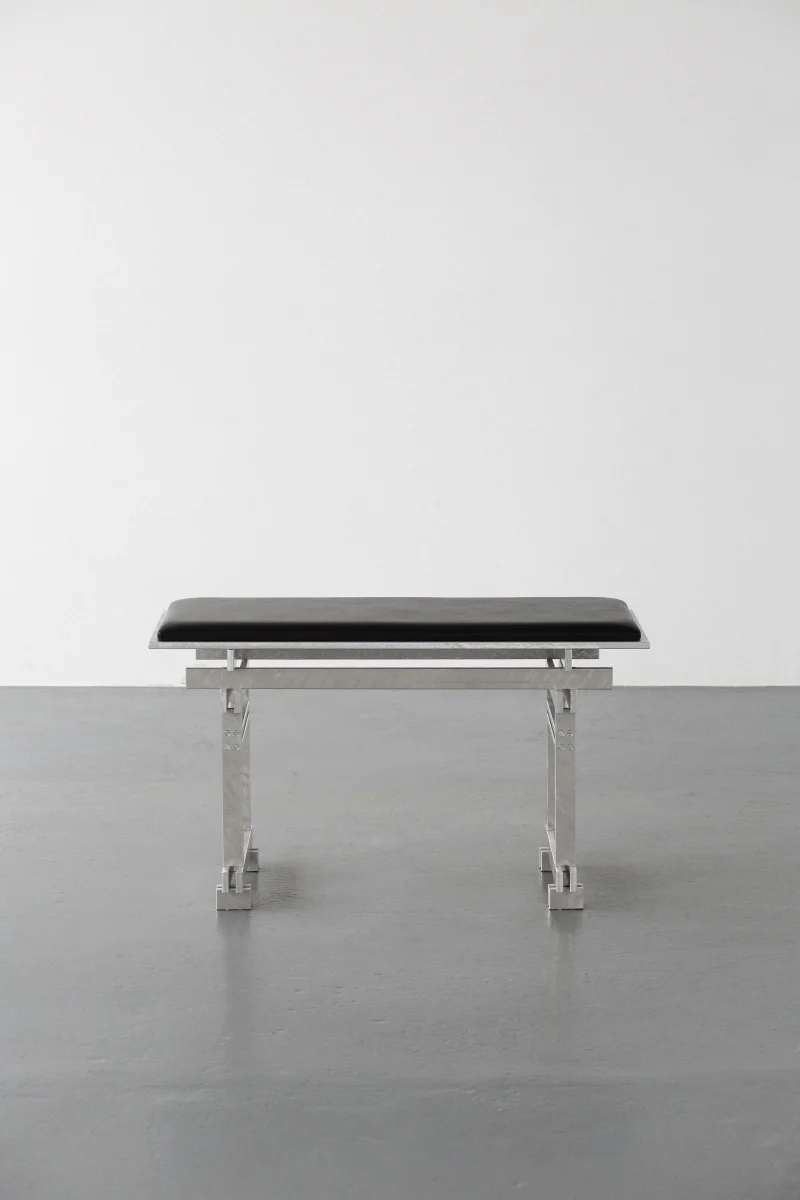 Gio Bench is part of “ALUCUTS” (2021 – 2023) furniture series, showcasing simple yet sturdy bolted assemblies of 12mm squared cuts of aluminium plates. The cuts are organized empirically until the piece reveals itself. Craft is kept to its bare minimum: the shiny edges are scarred by the blade, and contrast with the brushed finish; countersunk Allen bolts details underline the connections.