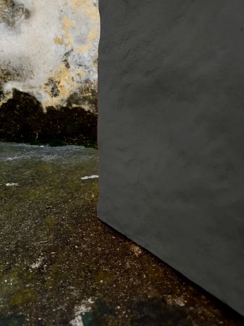 For this project, he chose to focus on cardboard and paper waste, reimagining these materials through a meticulous handcrafted process. The cardboard is soaked in water, combined with gypsum and PVA glue, and transformed into a malleable, sculptural medium. This material is then hand-dyed and applied to a structural base of wood and metal mesh. Once dried, each piece is sanded and finished with wax, resulting in a stone-like texture that merges the organic with the industrial.