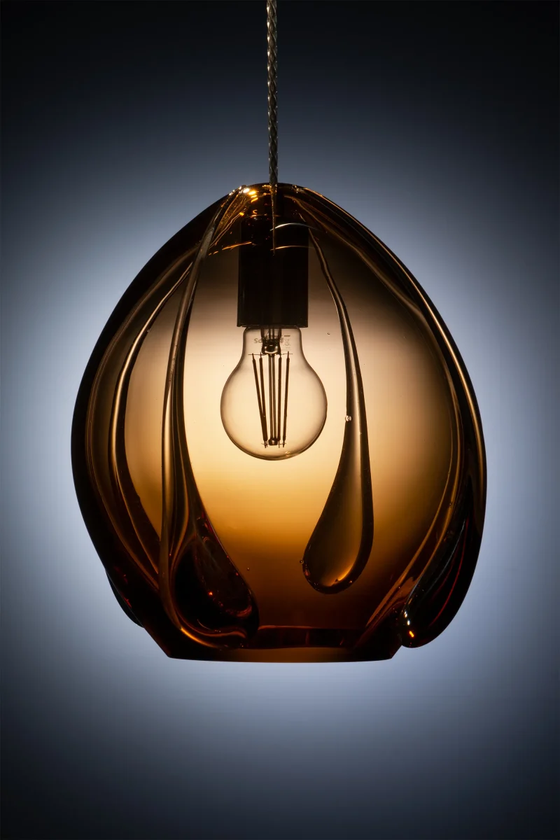 From Georgiev Zabeta’s “Glass Drops” series, this contemporary mouth-blown pendant lamp features fire opal glass, casting a warm amber glow. The exquisite use of fire opal glass adds a unique, captivating charm, creating a cozy atmosphere with its soft, amber light.