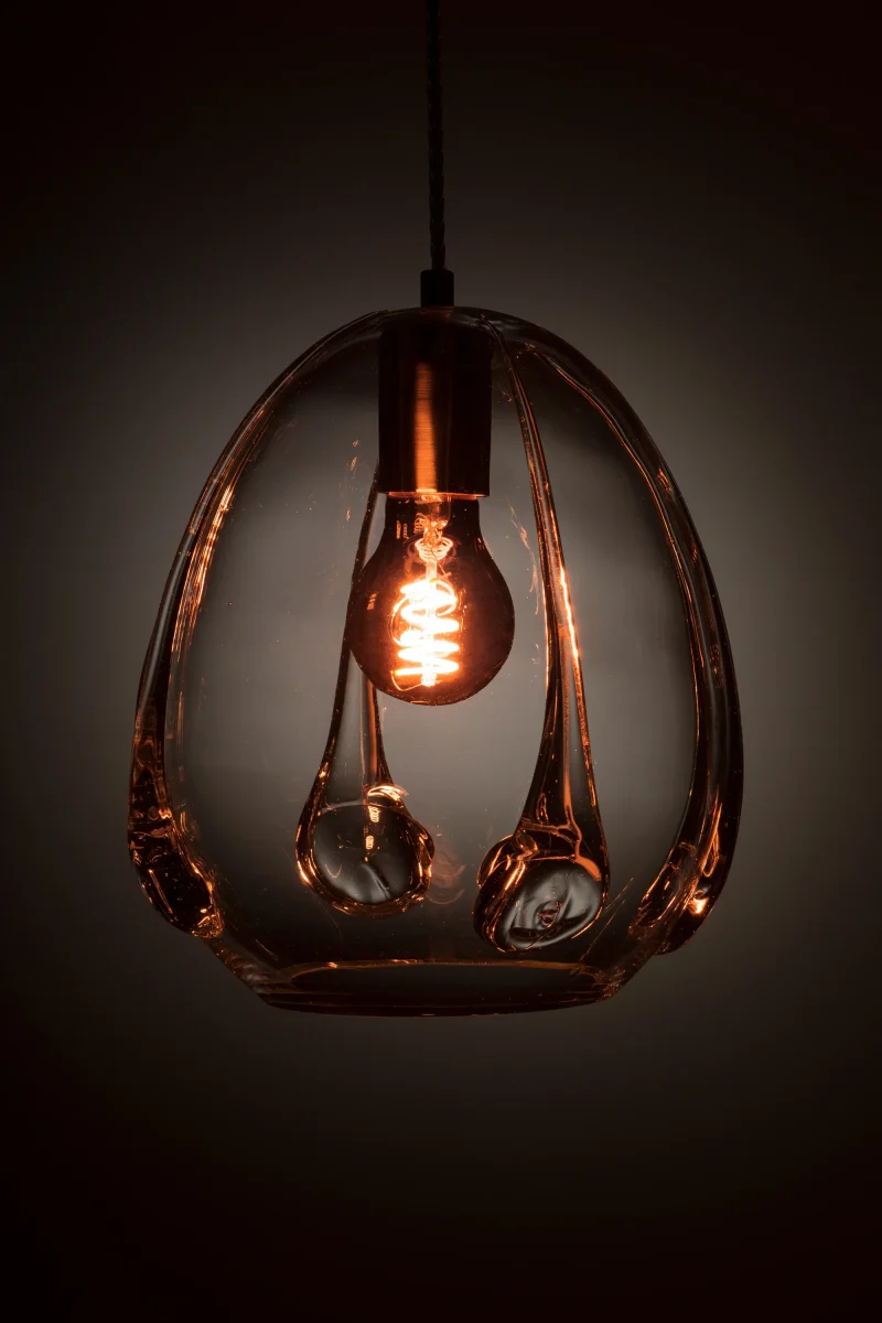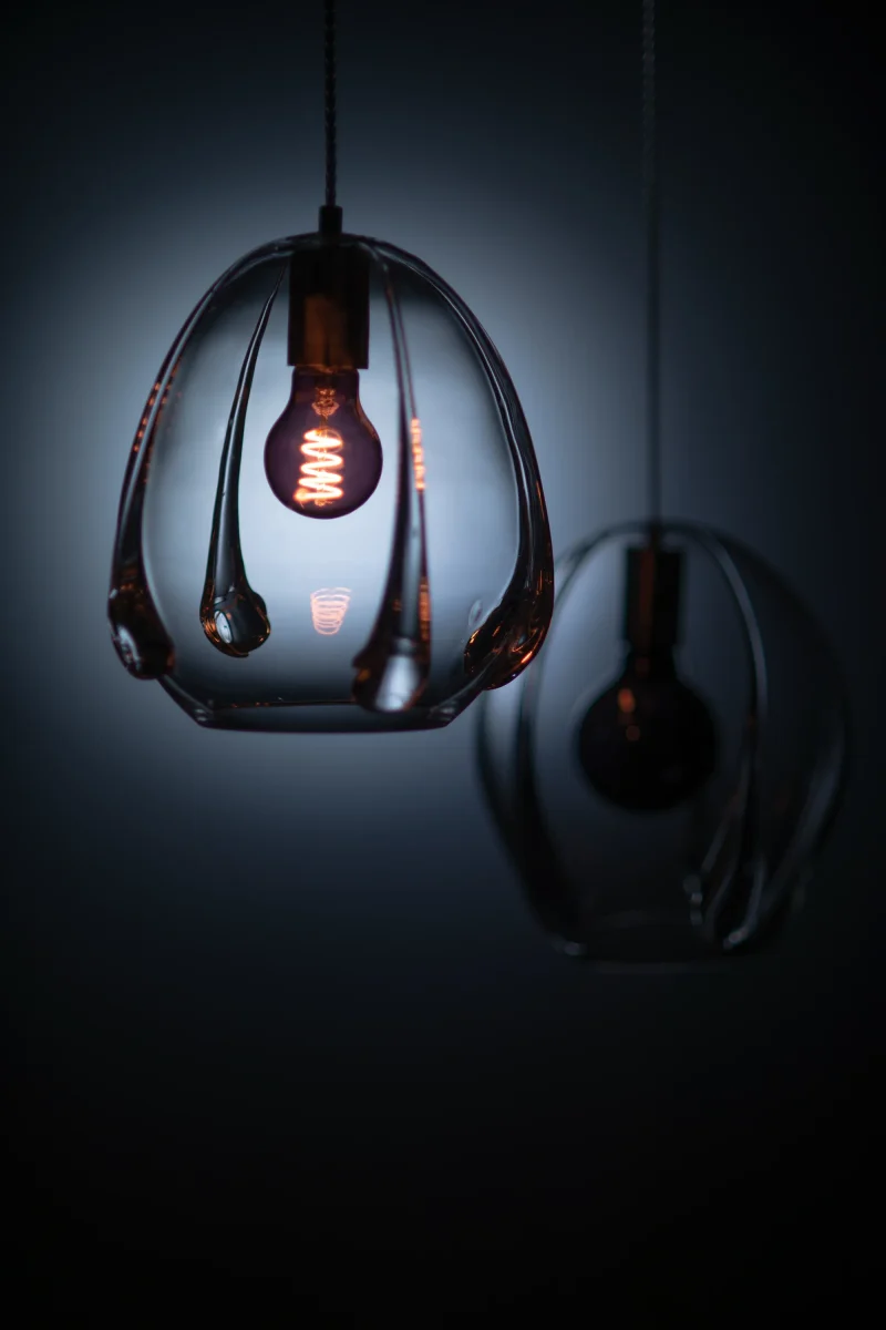 This futuristic pendant lamp, by Bulgarian based designer, Georgiev Zabeta, made of transparent, mouth-blown glass, creates a space-like atmosphere. Its rounded and softly curved shape produces an intriguing interplay of light that varies with the selected bulb.