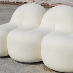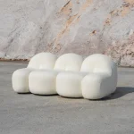The Glove Couch, was conceived in 3D software by thickening a curved line. The seat encourages you to sit in its various folds, creating a condition in which you feel held. The form of the item speaks to the industrial context in which it was made. This shape, reminiscent of throwie graffiti, became the basis for an entire graphic system.