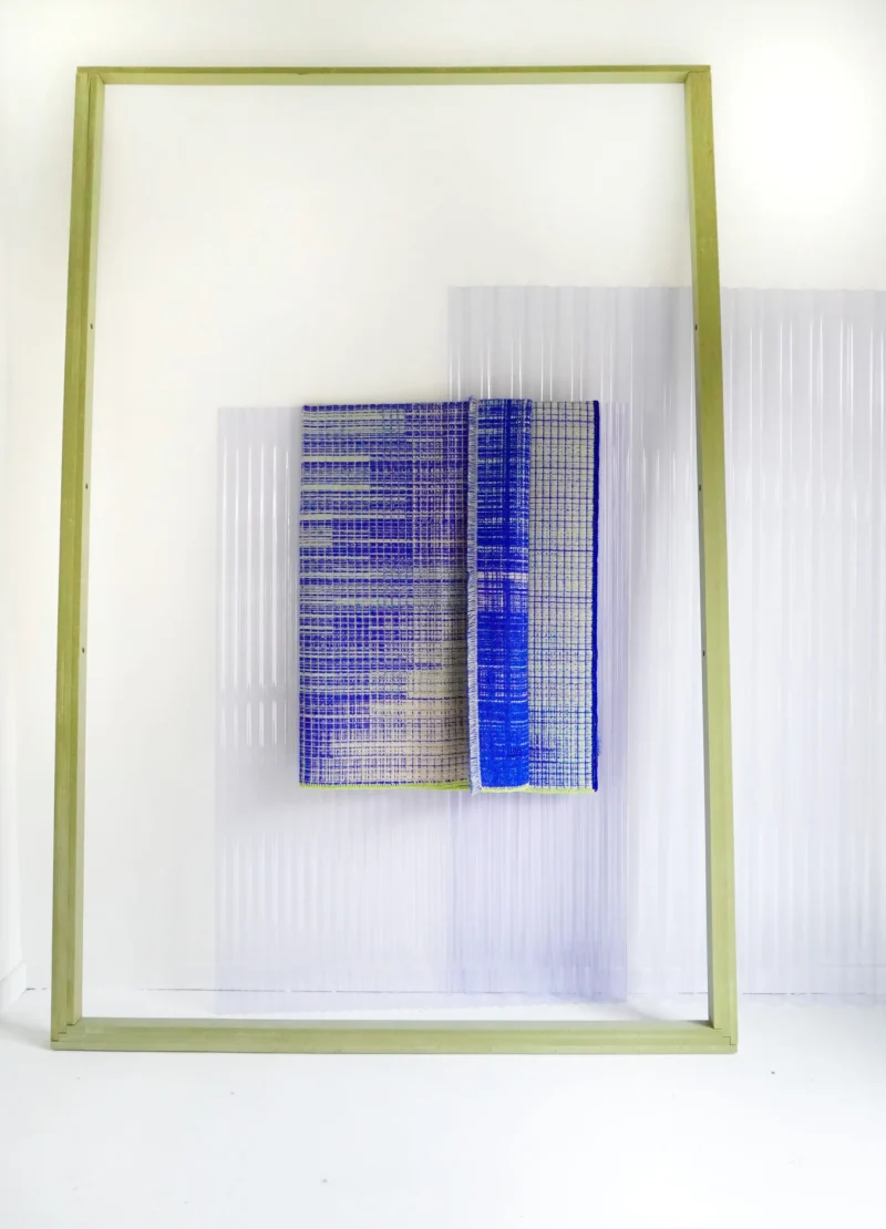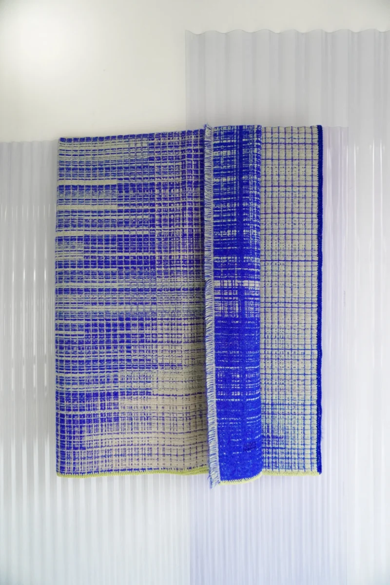 Using natural materials, like wool and cotton, with subtle yet expressive properties, her woven works reveal an organic and tactile feeling, brought into the present by bold graphic patterns.
