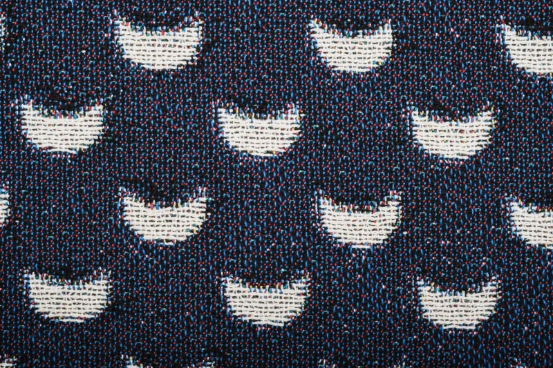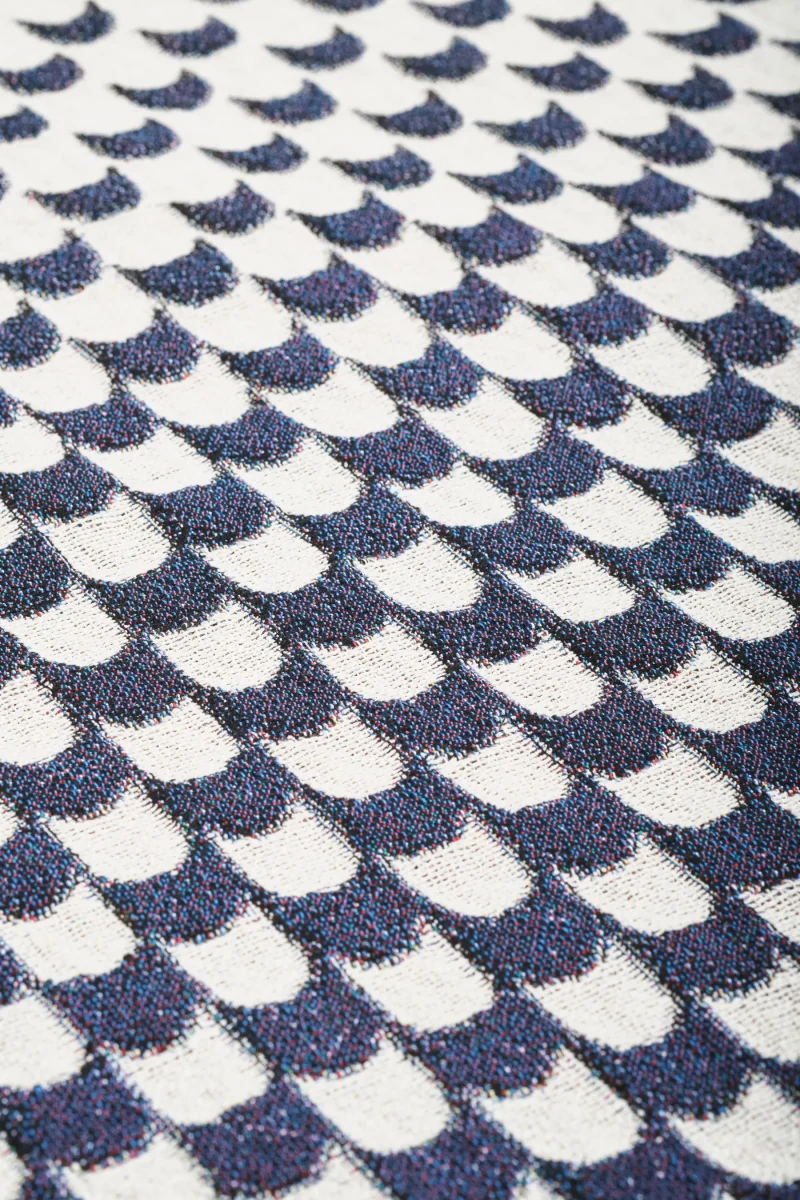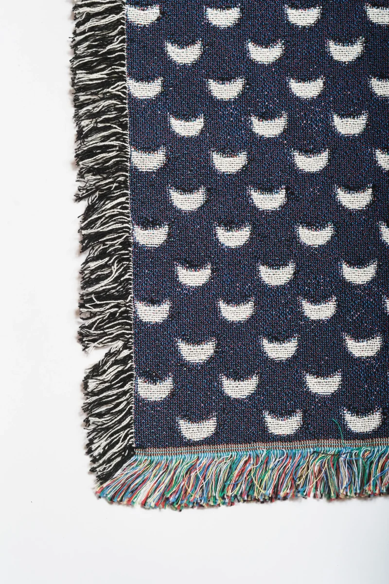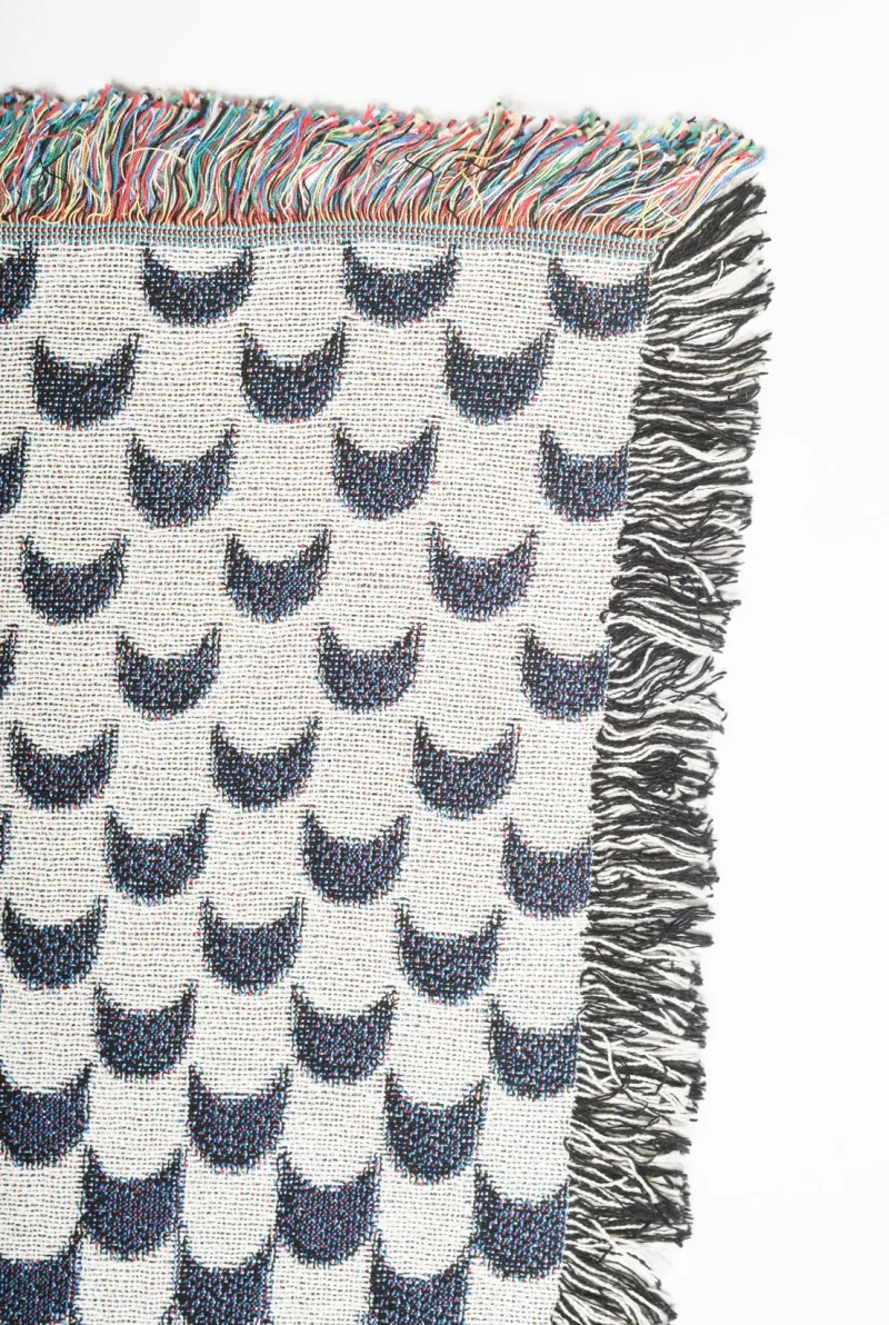 “Escheresque Blue” is a woven jacquard throw / blanket made from 100% cotton, highlighting re-invented vintage patterns for a timeless home accessory. Made in USA.