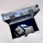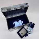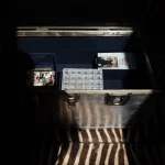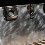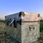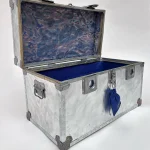 In order to maintain lightness, a fundamental requirement for a travel trunk,I chose to make it with 4 millimetre birch panels, a wood that is easy to work with and very robust, externally plated with 0.5 mm thick aluminium foil. On the outside, I wanted to maintain the aesthetics of the trunk-box, so I salvaged the hinges, lock and profiles from the old family trunk.