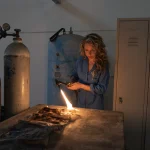 The inside of the lid is embellished with a material that represents my stylistic signature, a soft and ductile steel fabric decorated by myself with diffused heat from an oxy-acetylene torch in iridescent shades reminiscent of the starry sky of Africa. The compartment is layered, the first shelf is a small compartmentalised jewellery tray, similar to a box of chocolates, then at below there are more boxes-layers up to a false bottom to hold letters, cards and secret photographs.