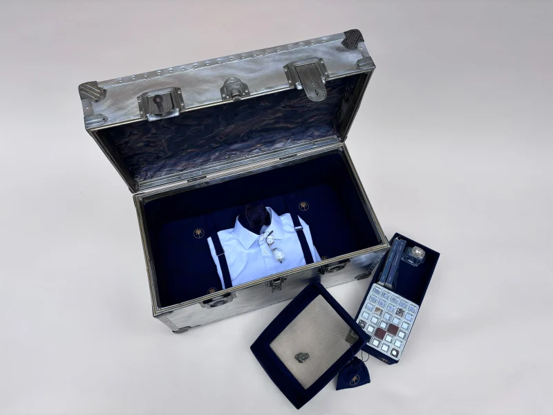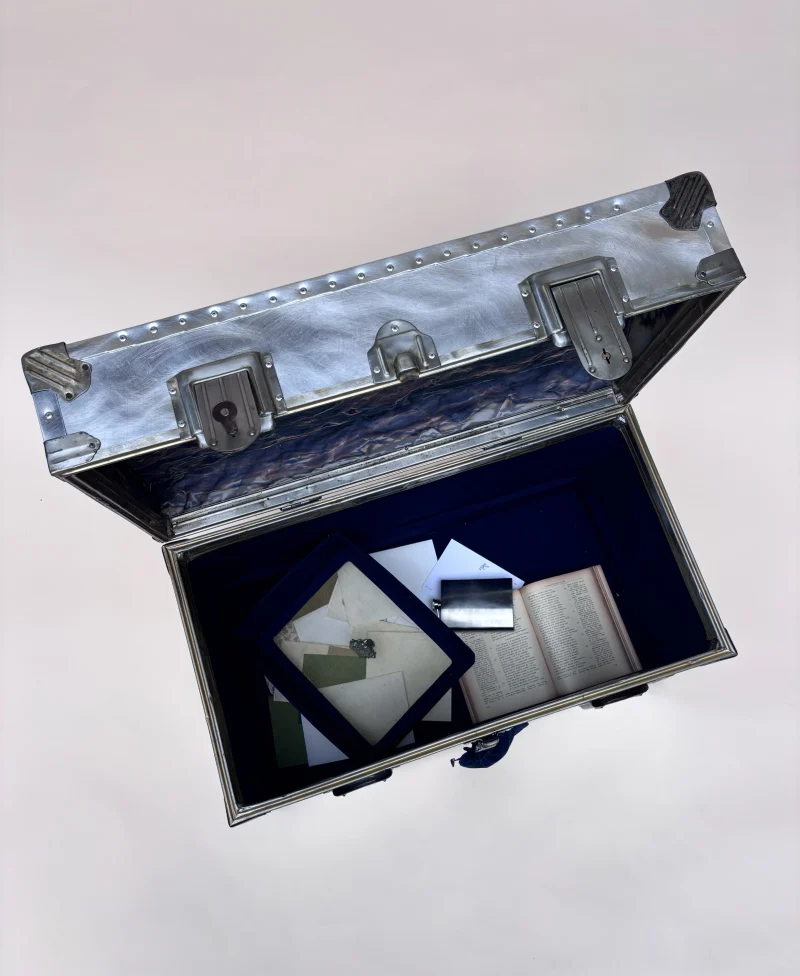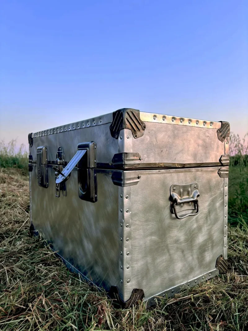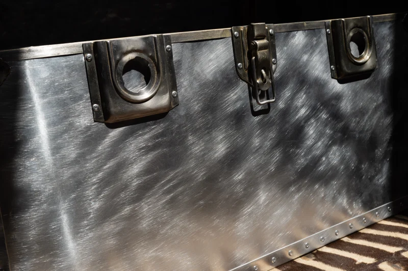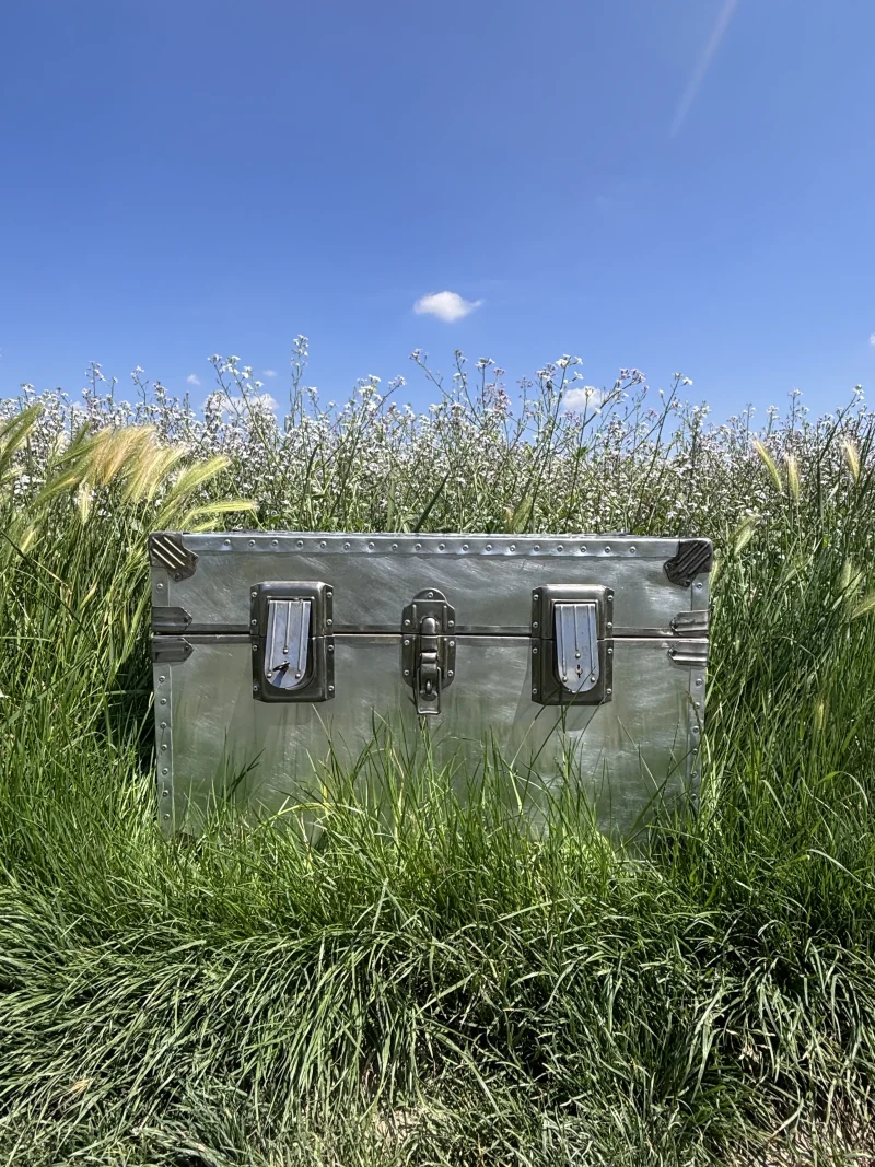 In order to maintain lightness, a fundamental requirement for a travel trunk,I chose to make it with 4 millimetre birch panels, a wood that is easy to work with and very robust, externally plated with 0.5 mm thick aluminium foil. On the outside, I wanted to maintain the aesthetics of the trunk-box, so I salvaged the hinges, lock and profiles from the old family trunk.