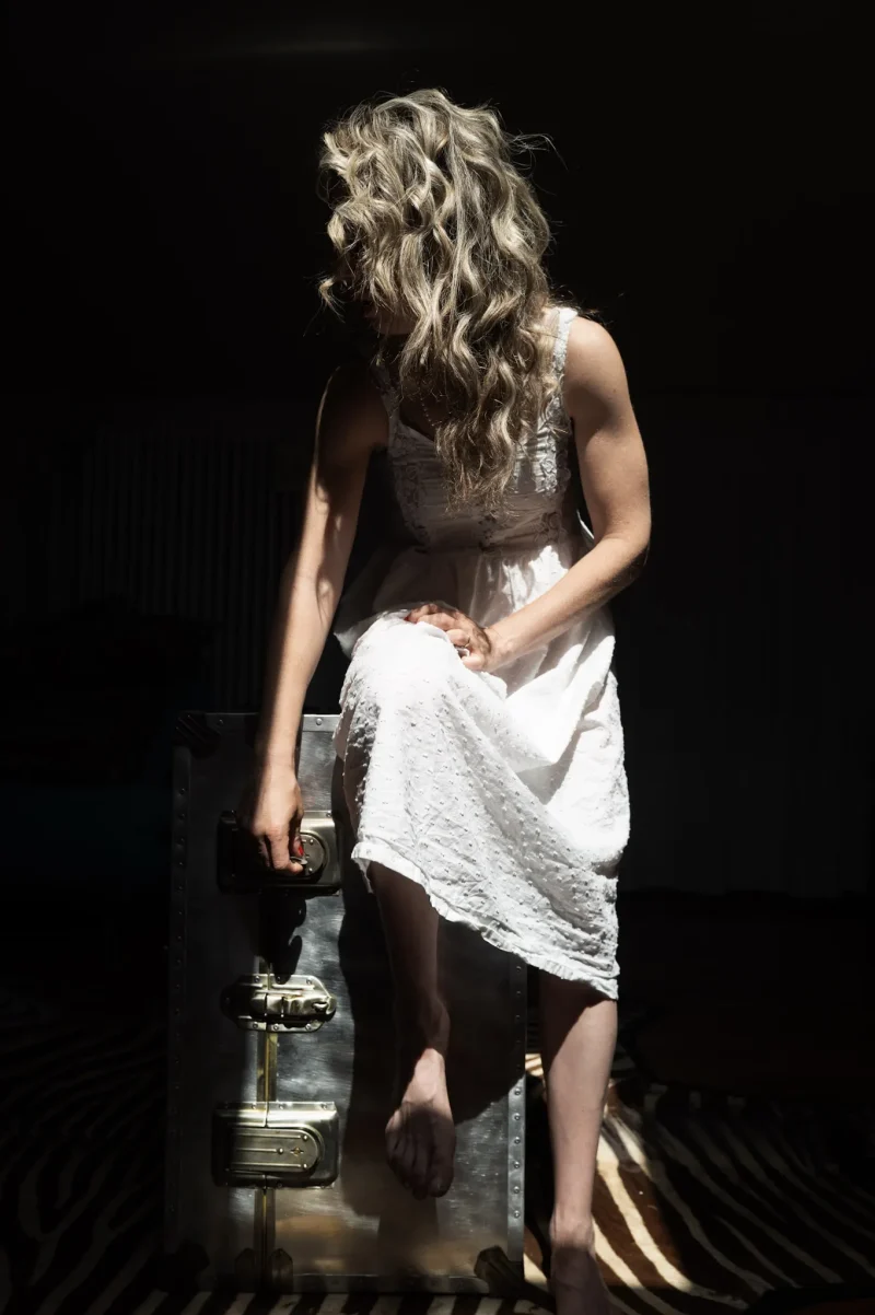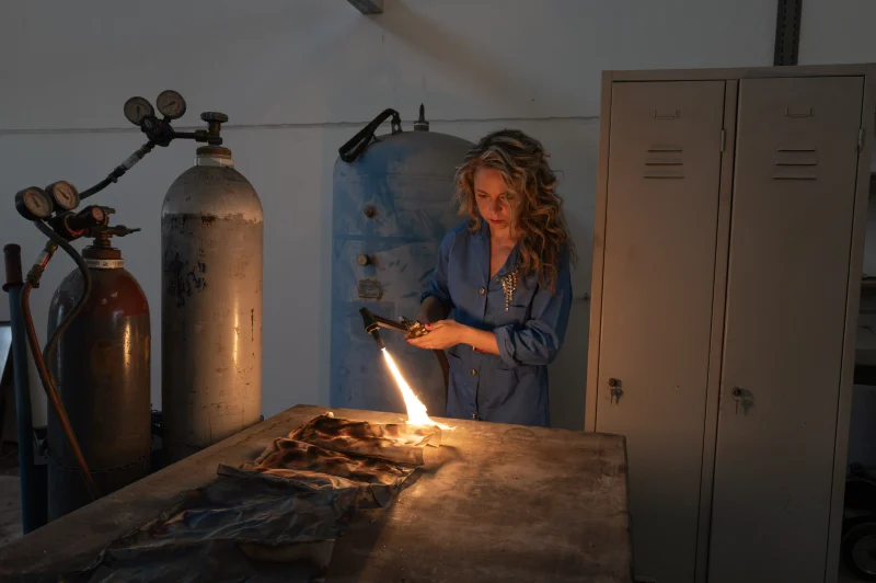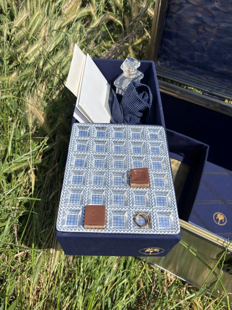 The inside of the lid is embellished with a material that represents my stylistic signature, a soft and ductile steel fabric decorated by myself with diffused heat from an oxy-acetylene torch in iridescent shades reminiscent of the starry sky of Africa. The compartment is layered, the first shelf is a small compartmentalised jewellery tray, similar to a box of chocolates, then at below there are more boxes-layers up to a false bottom to hold letters, cards and secret photographs.
