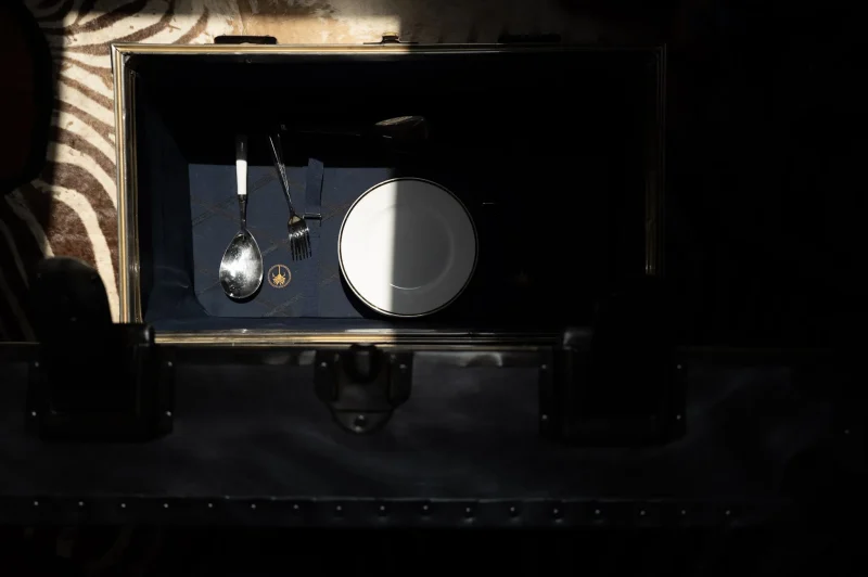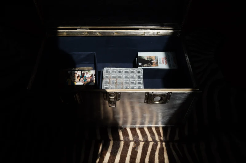 A travel trunk inspired by by the luxurious trunks created with such craftsmanship by Maison Goyard since 1972 and by Duchamp’s work “box in a Suitcase” but also by the big green trunk my in-law’s bought to move to Gabon for work in 1980 and filled with plates, linen, books and few cherished objects. The same trunk that 6 years after , returned to Italy filled with many African souvenirs , fabrics, photographs, masks , ceramics.