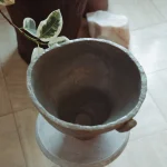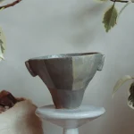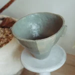 This ceramic vessel explores the checkered hues of green. The surface is divided into muted tonal planes, with soft transitions between earthy greens. Fine texture from the forming process remains visible beneath the glaze, emphasizing touch and process.