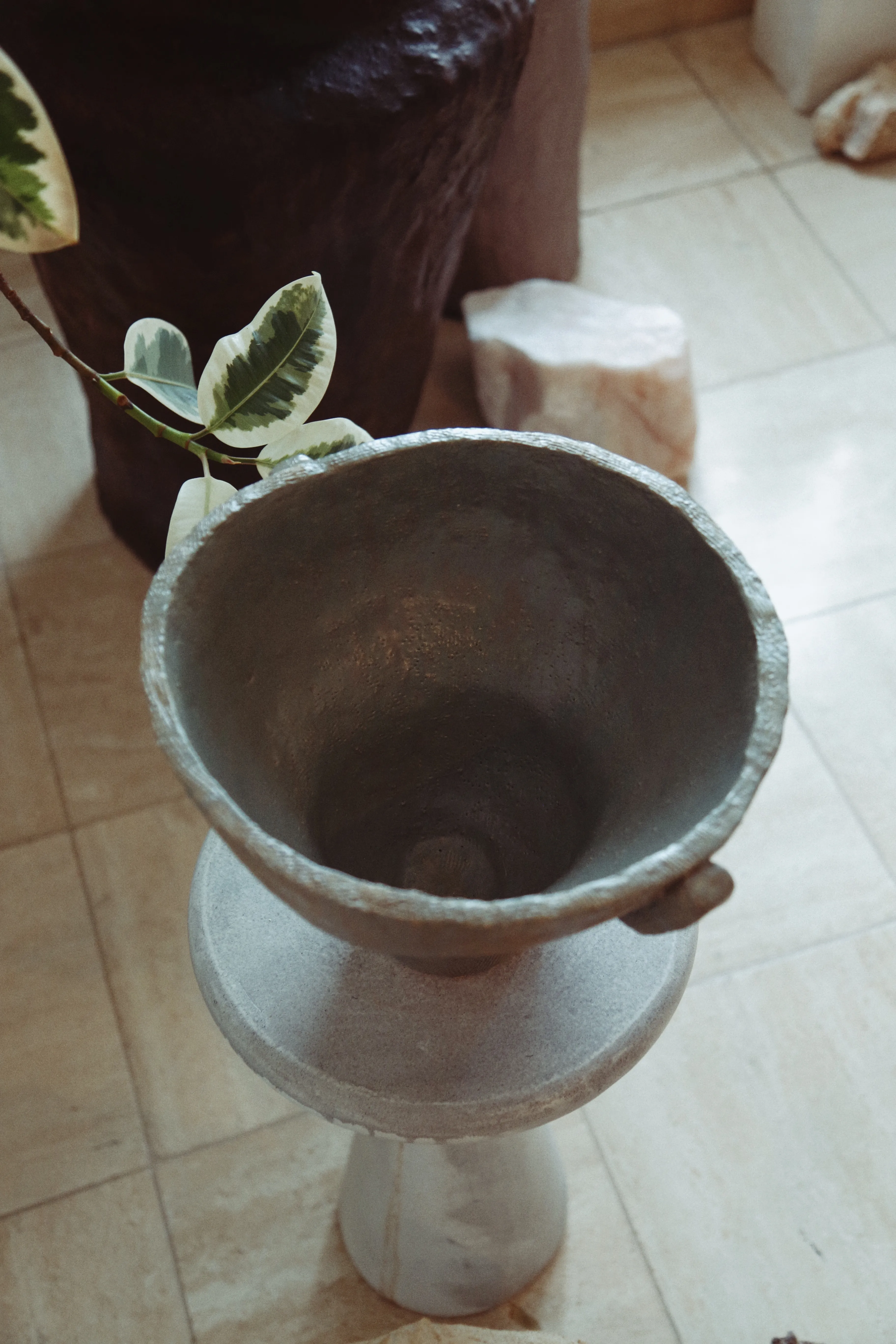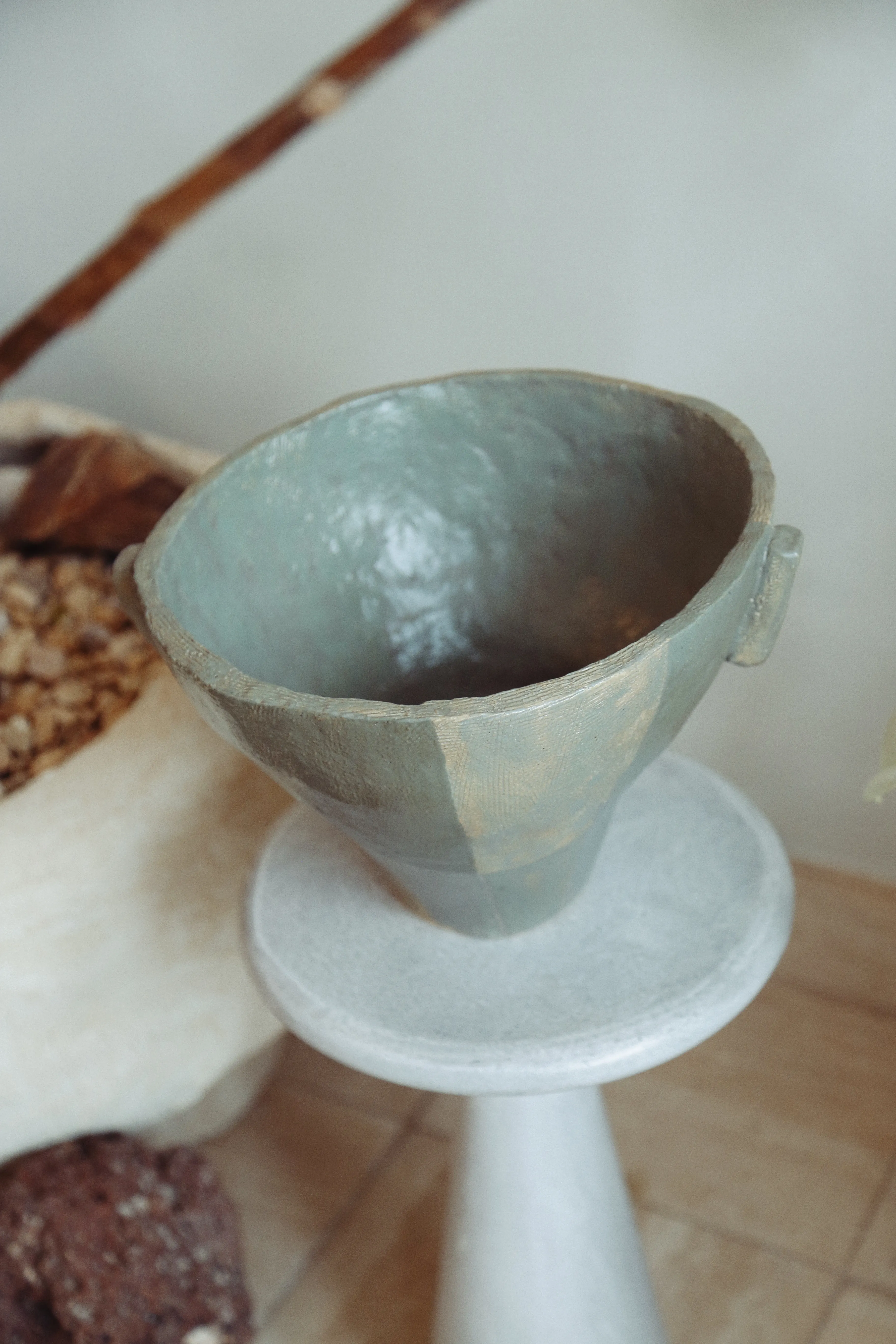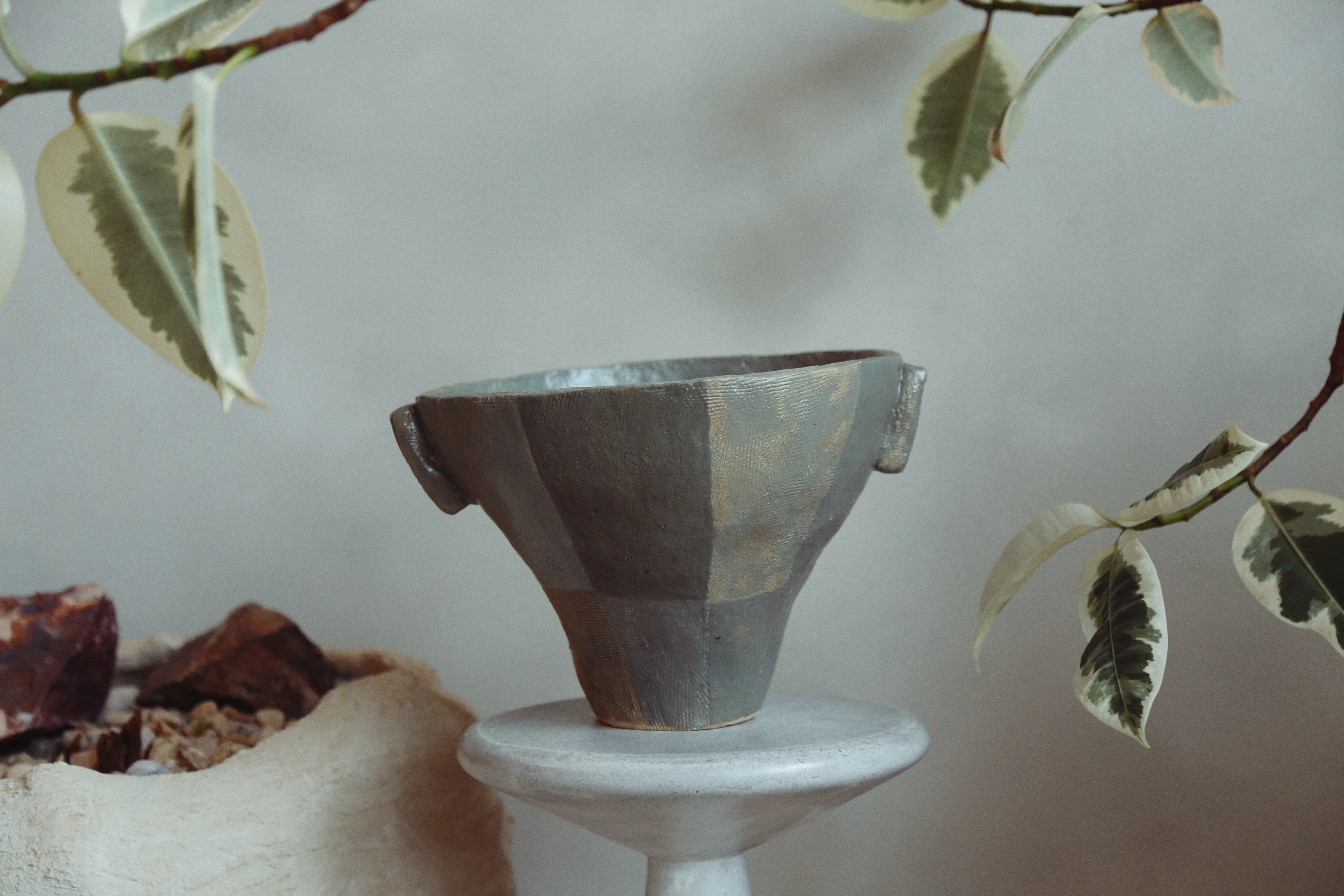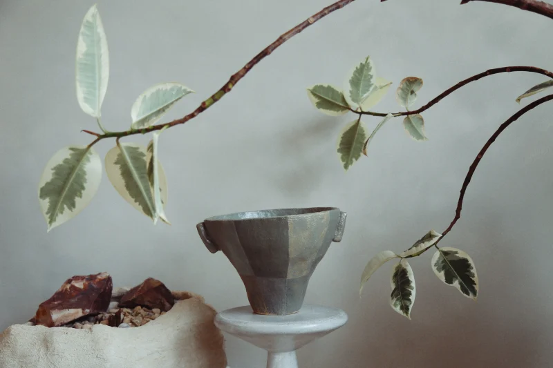 This ceramic vessel explores the checkered hues of green. The surface is divided into muted tonal planes, with soft transitions between earthy greens. Fine texture from the forming process remains visible beneath the glaze, emphasizing touch and process.