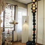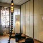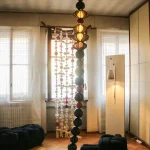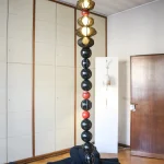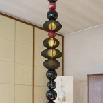 Guseul by WKND Lab is an experimental ceiling light crafted from multiple spheres employing various techniques. It consists of four distinct components: the black sphere, embellished black sphere, red sphere, and lighting fixture.
