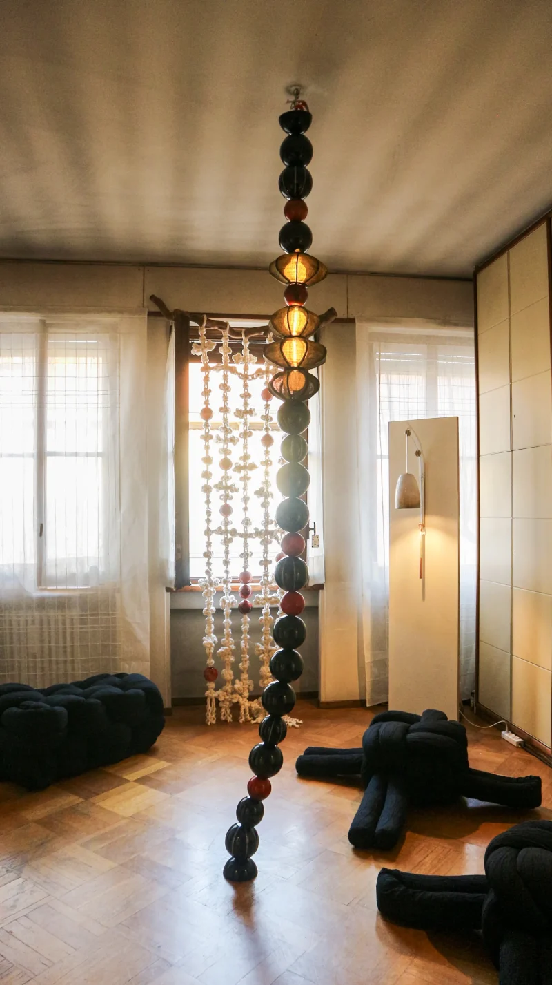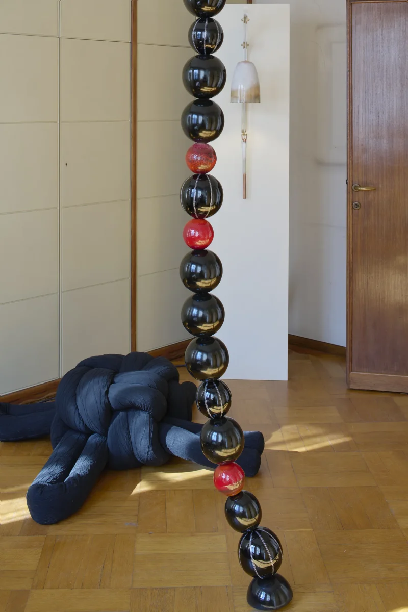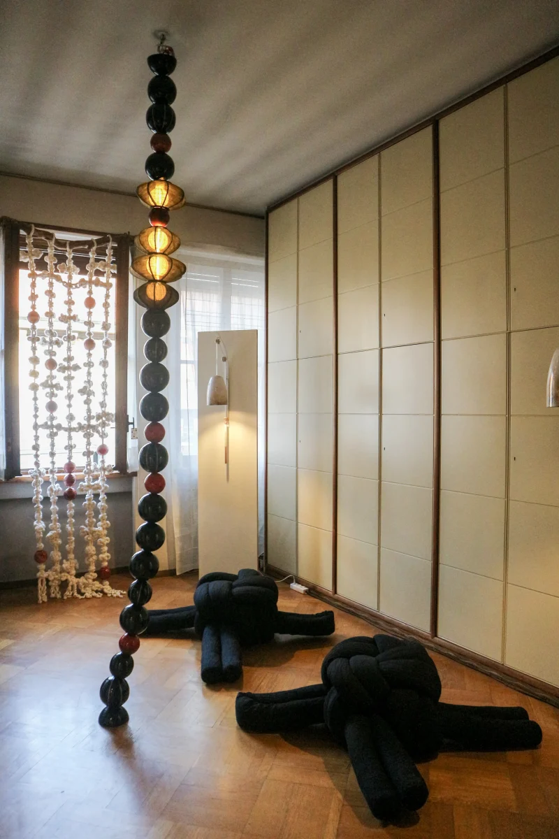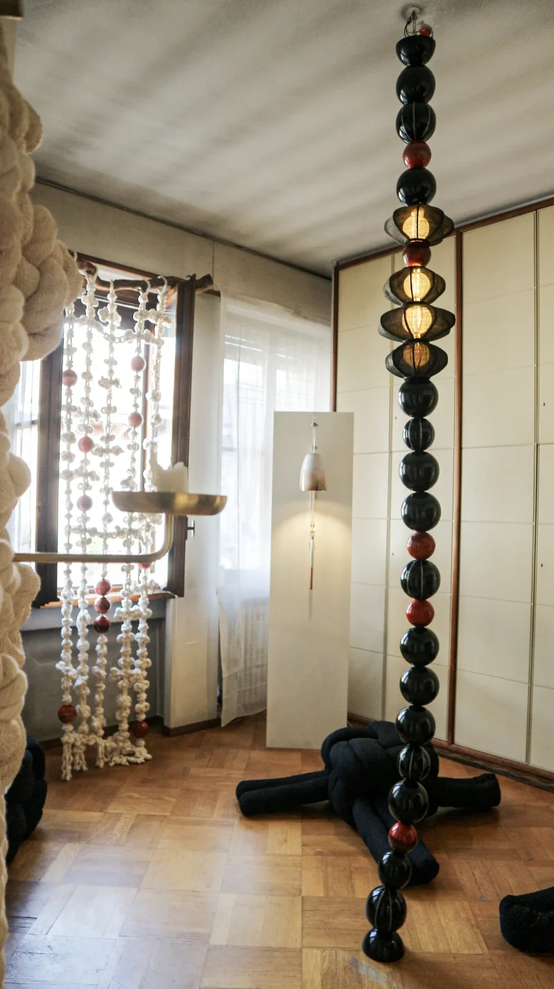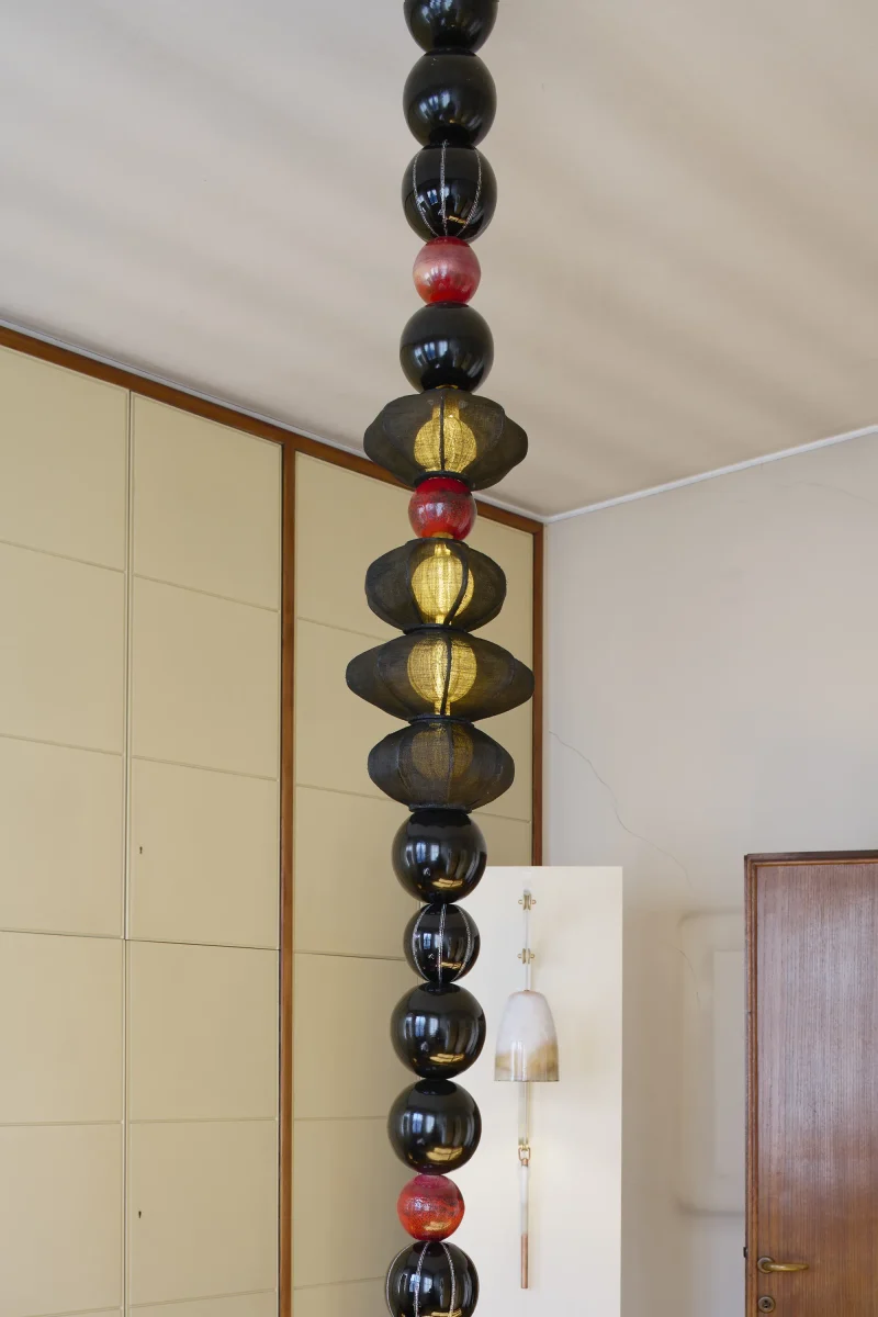 Guseul by WKND Lab is an experimental ceiling light crafted from multiple spheres employing various techniques. It consists of four distinct components: the black sphere, embellished black sphere, red sphere, and lighting fixture.