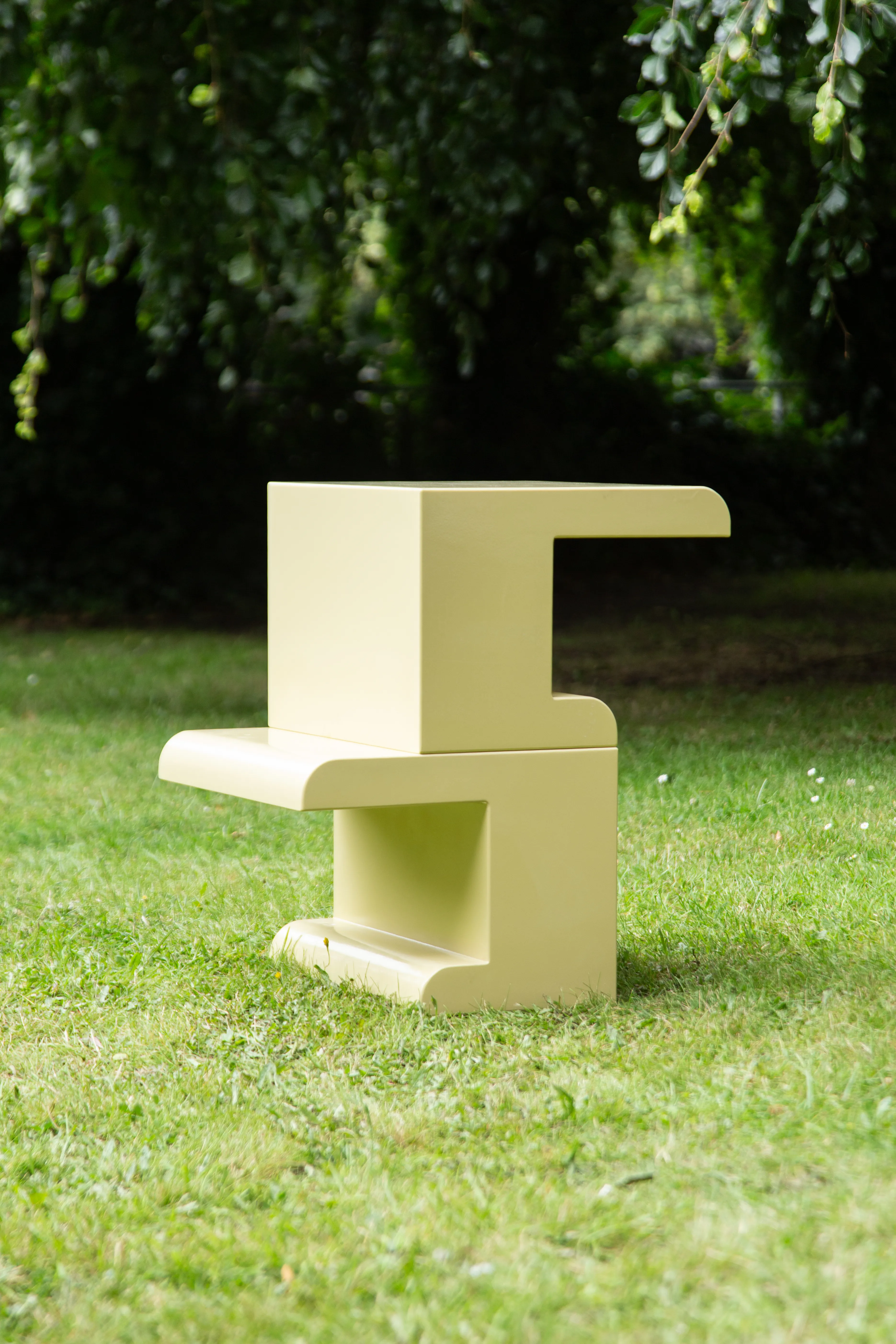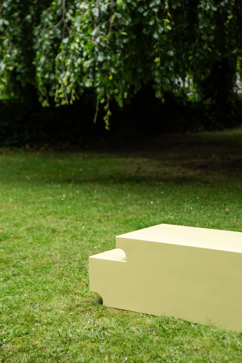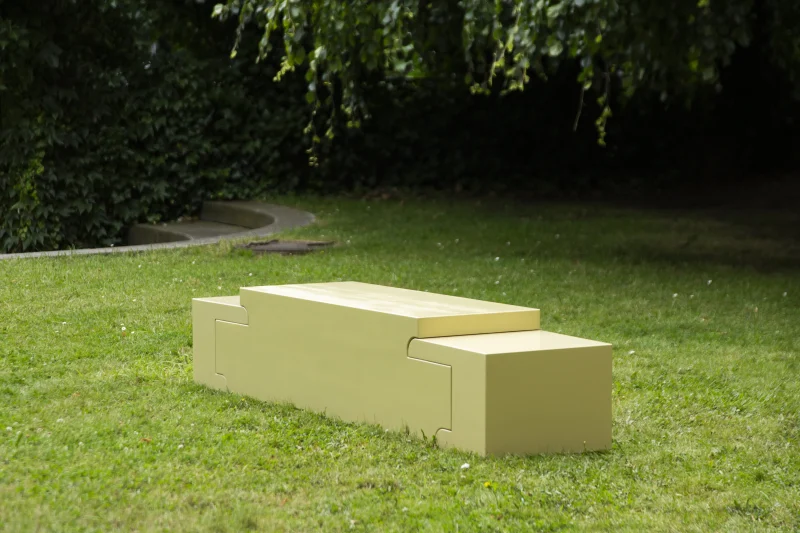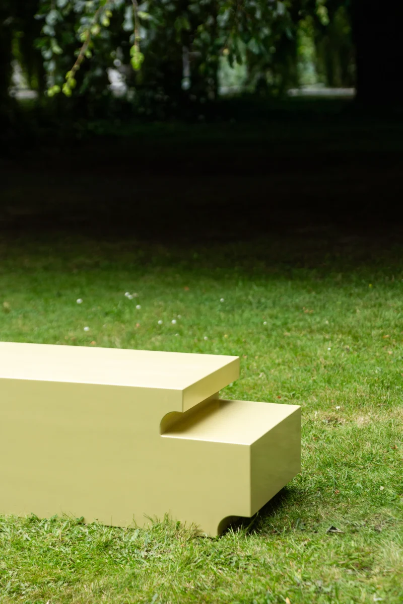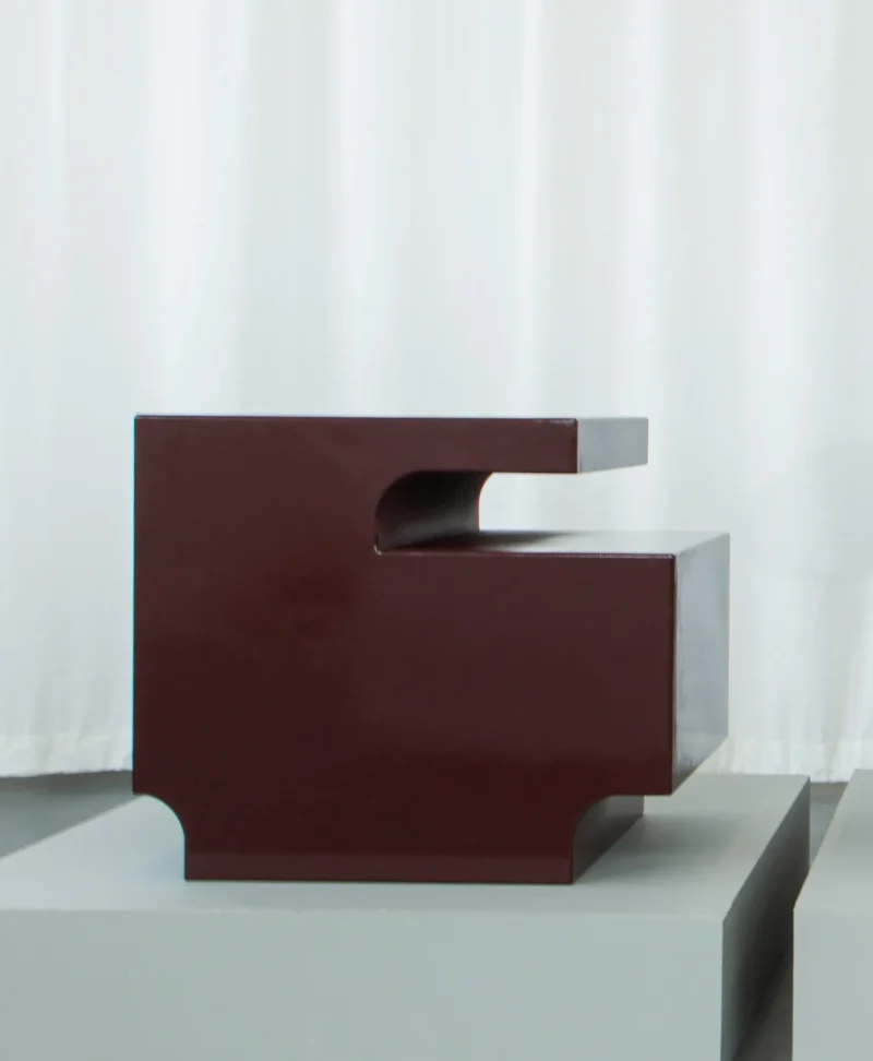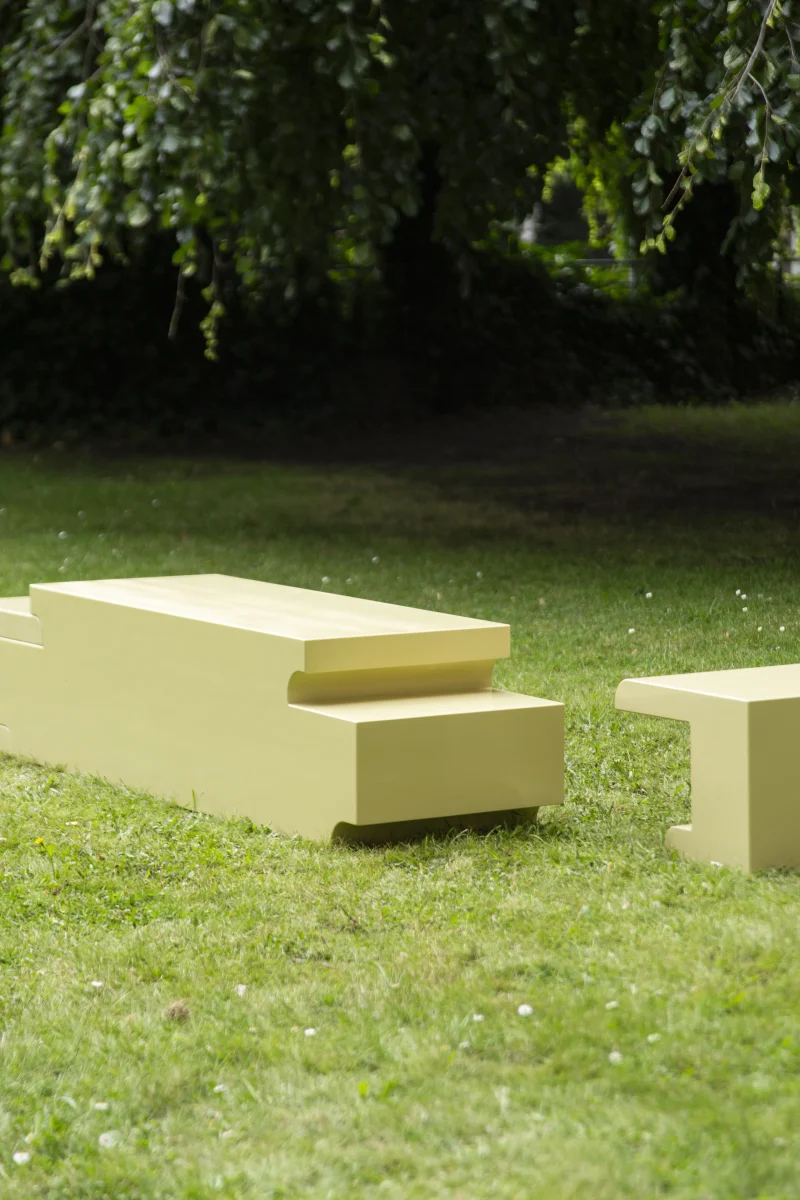 Rather than hiding construction details, the half-lap joint is projected onto the outer contours of the bench and side tables. Structural logic becomes form, and making becomes meaning. Each piece reads as a solid, architectural volume, while revealing the traces of joinery through its stepped silhouette.