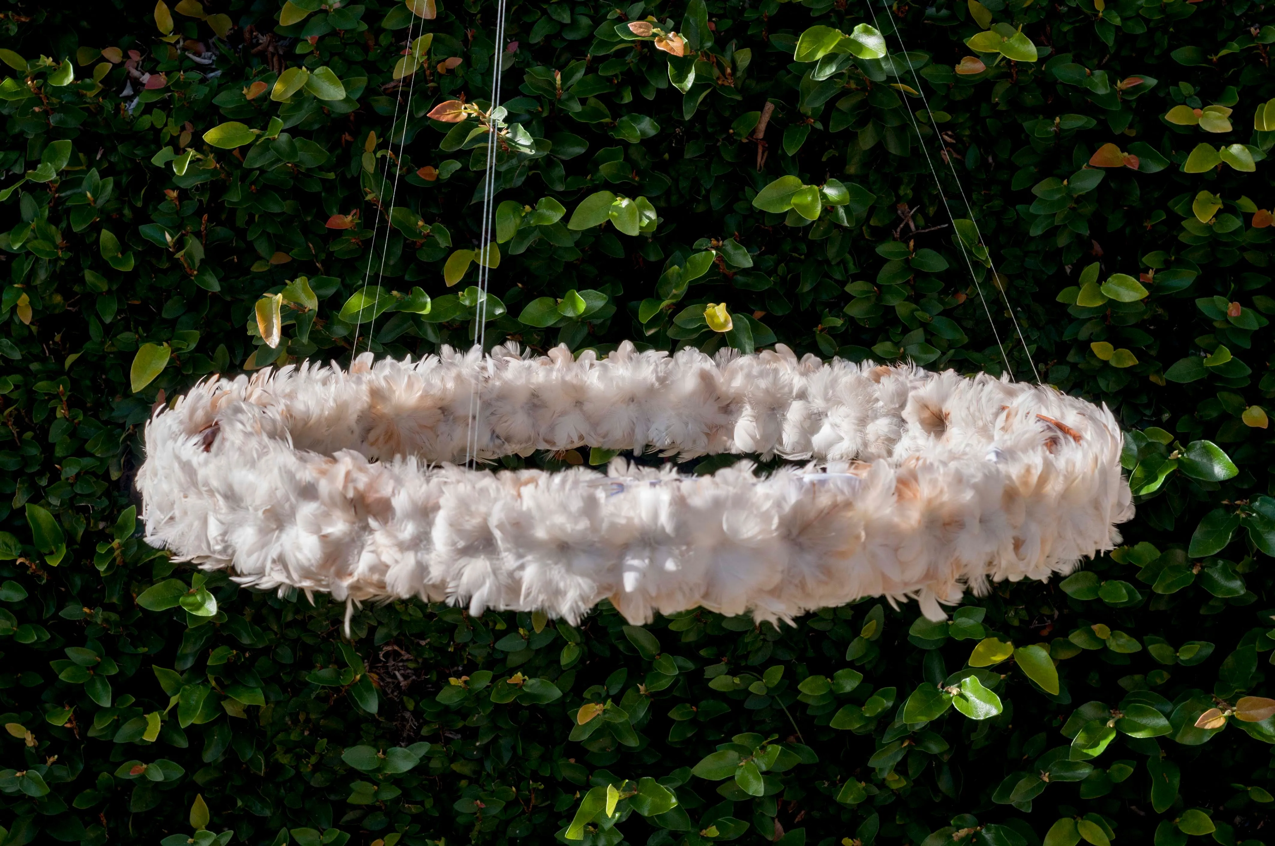 Indirect light luminaire made in recycled peroba wood with intertwined feather flowers, providing soft lighting. Suspended by steel cables, the luminaire floats delicately in the air.
