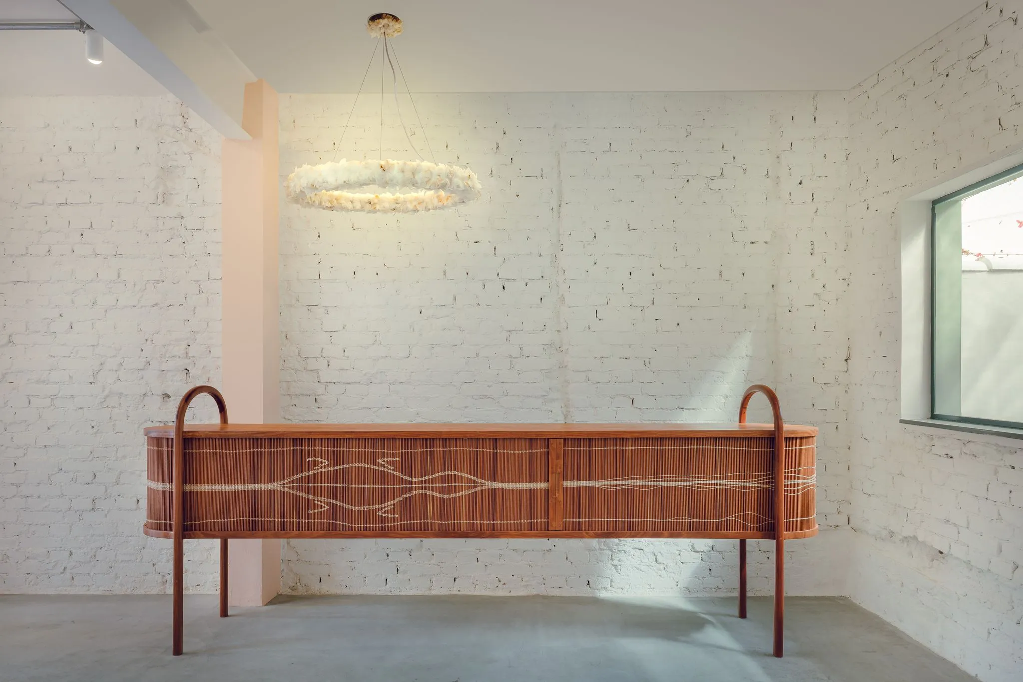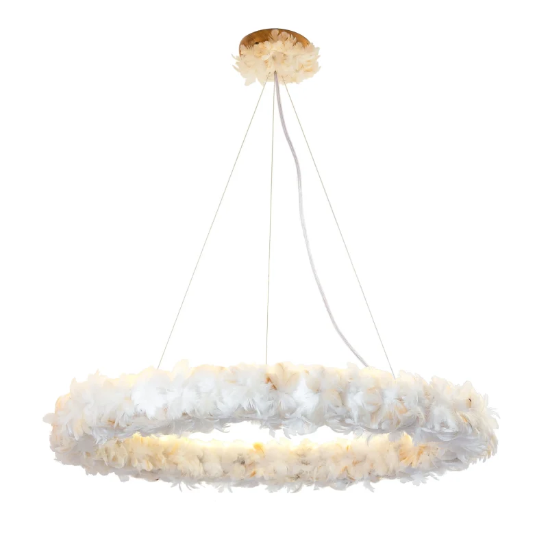 Inspired by the feather headbands traditionally used by the Pataxó indigenous women in their festivities and rituals. The feathers’ flowers that adorn the Halo luminaire were handmade by Txahamehé Pataxó, a young woman whose name n the indigenous language Patxohâ means flower of love, nothing more appropriate for her, who creates beautiful flowers with chicken feathers that she collects from the village lands.