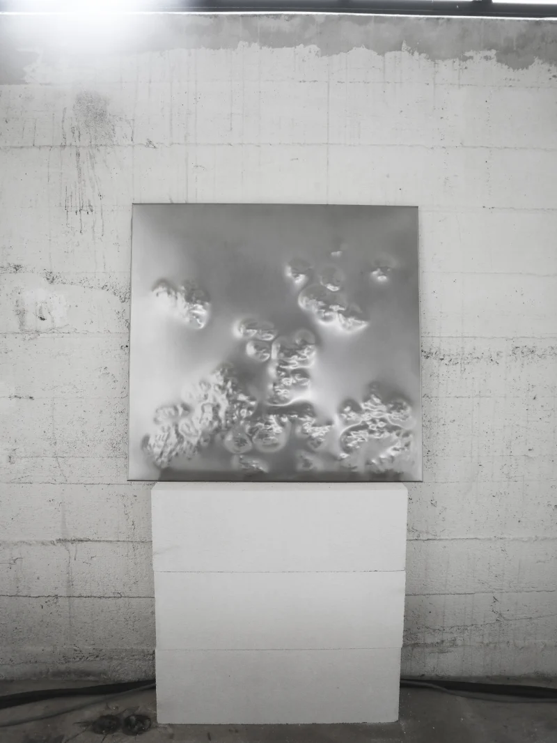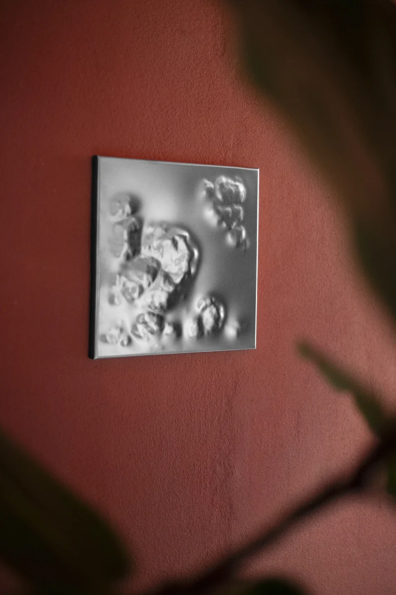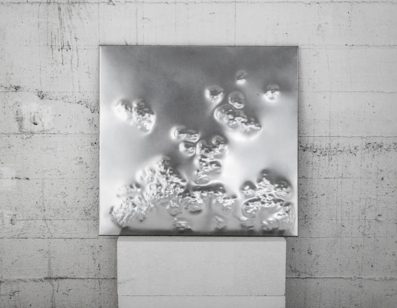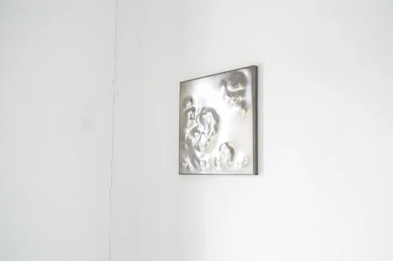 This wall piece capture the gesture of the artist, who hammered the metal sheet by hand. Despite the physical strength this technique requires, the pattern produced is surprisingly soft and organic. Each hammer blow creating a random deformation, the pattern will always be 100% unique.