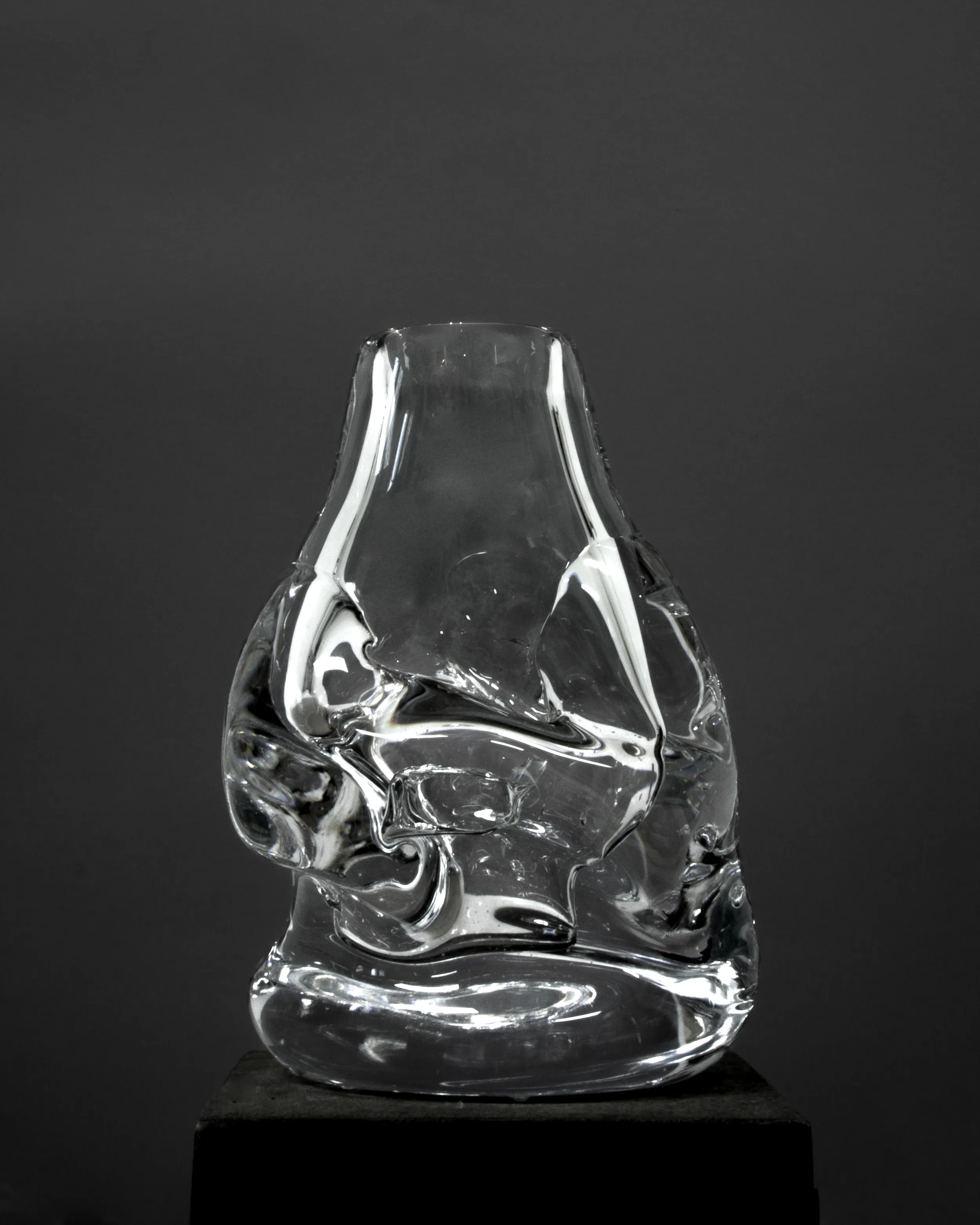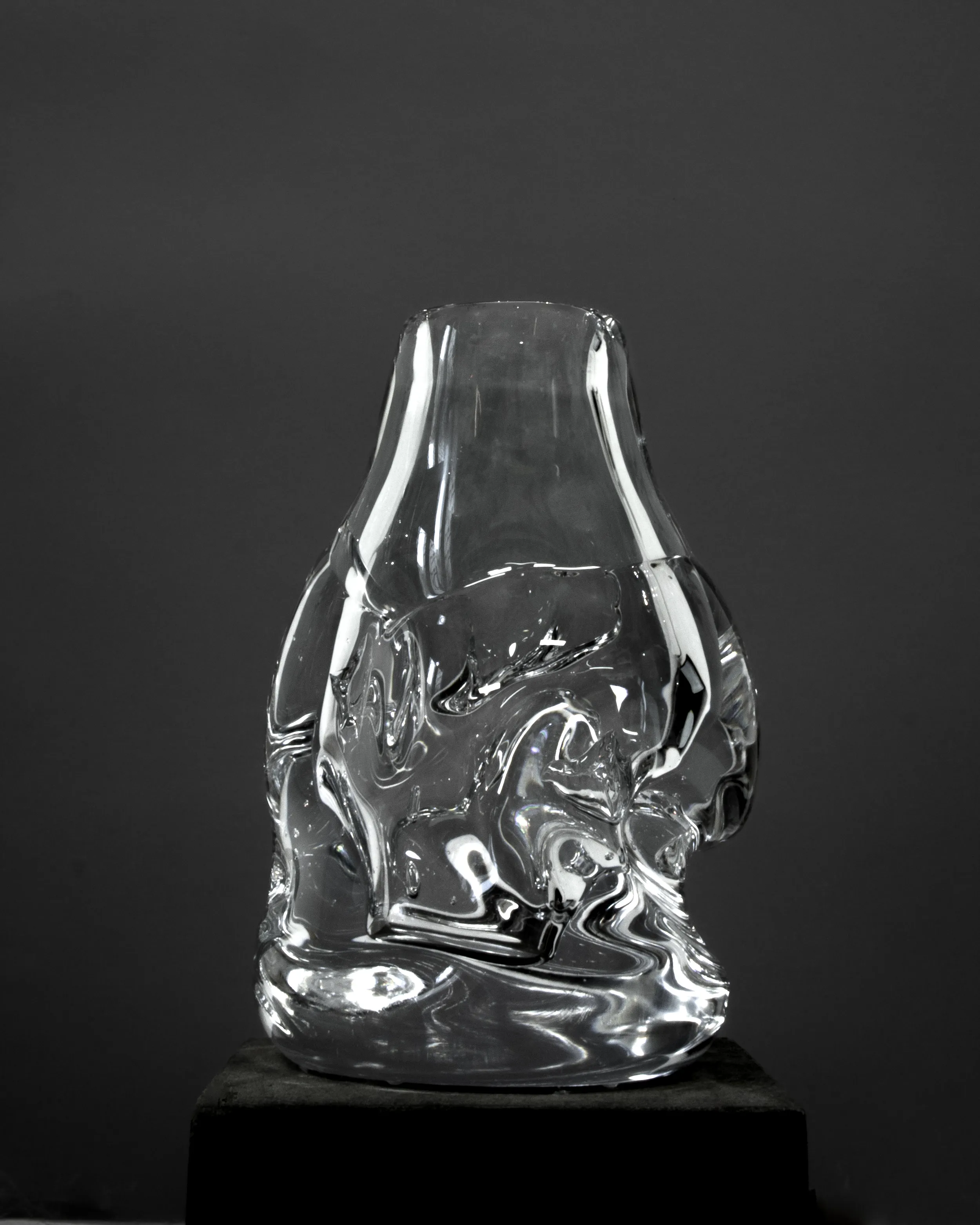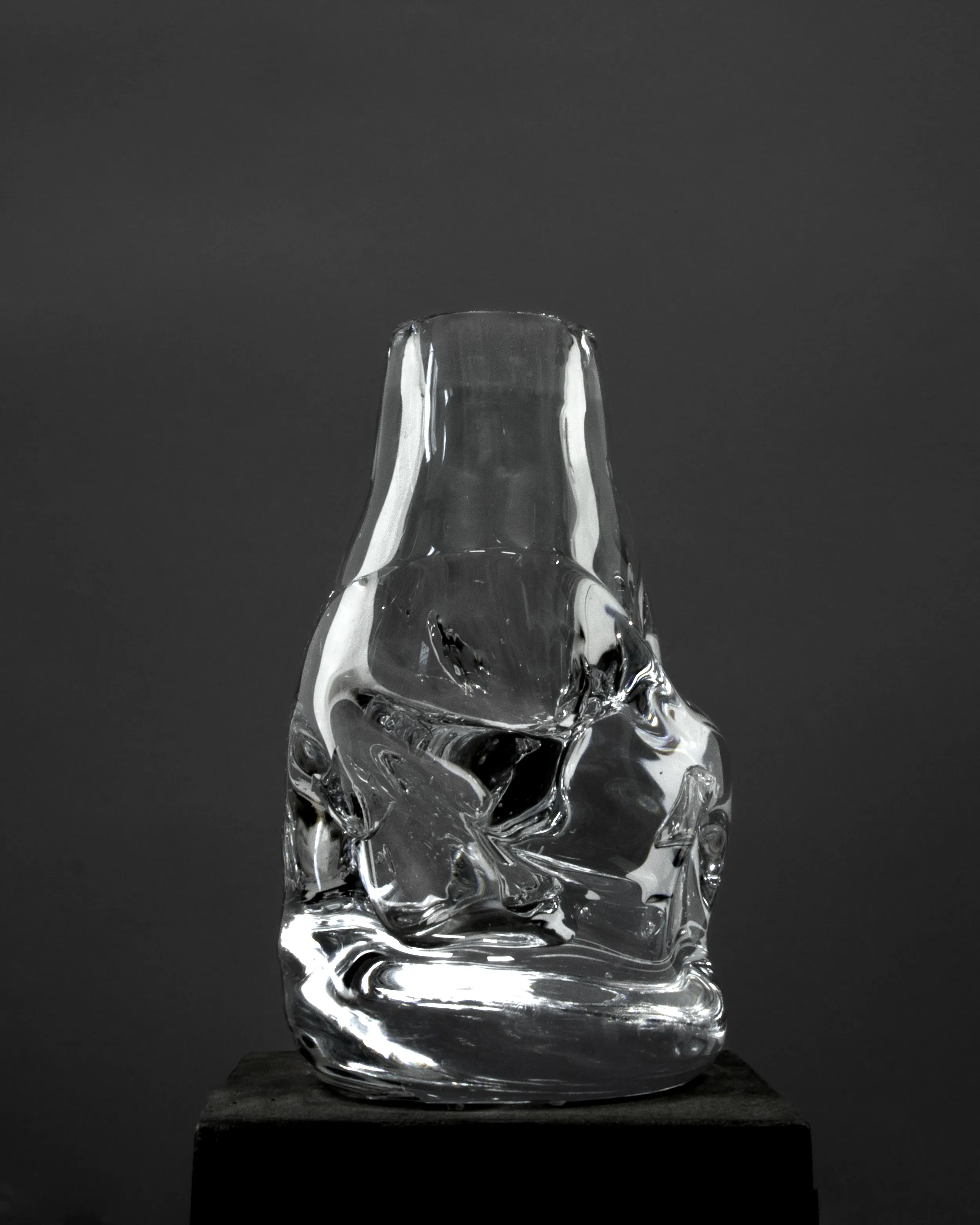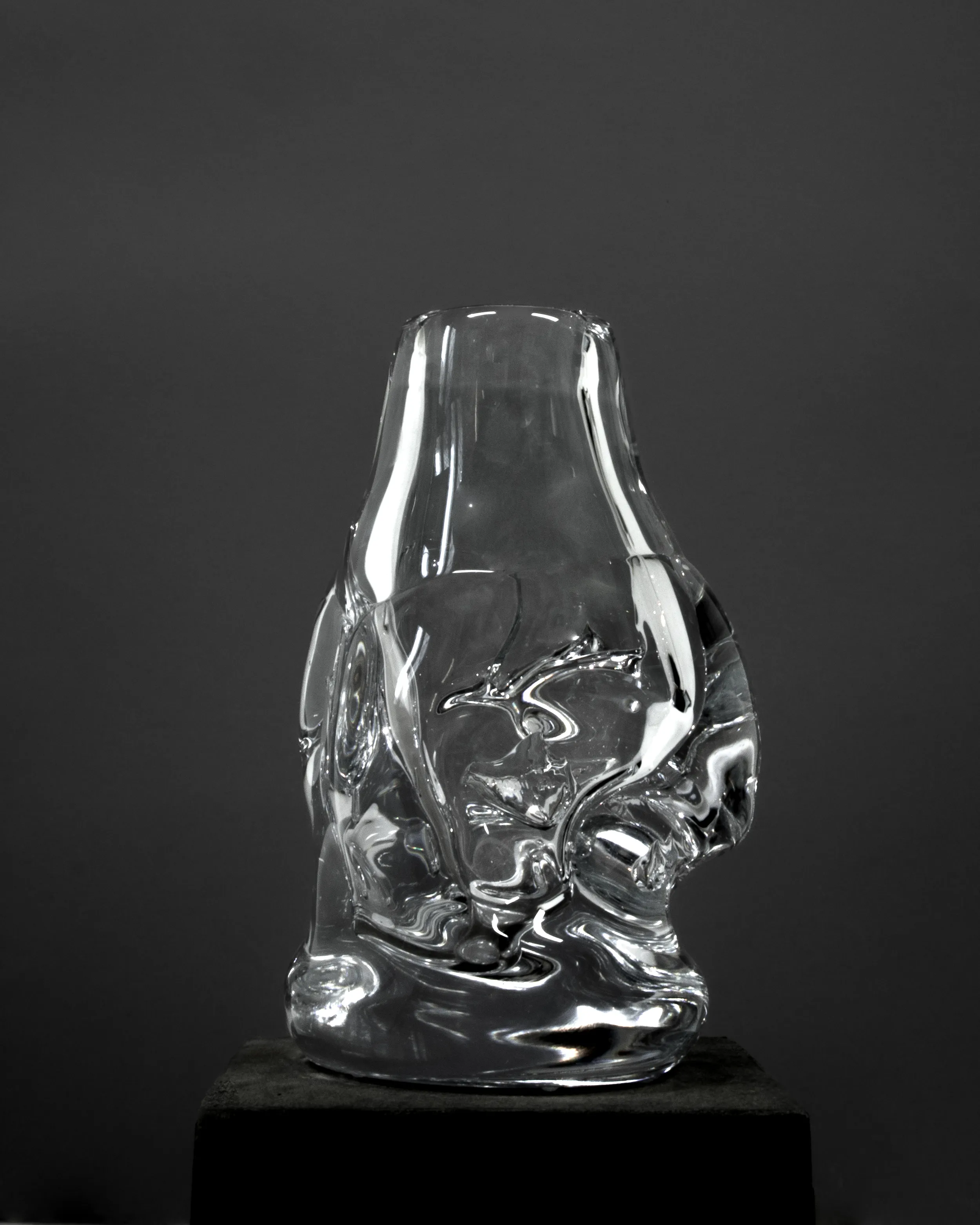 The glass may contain remains of sand, stones and wood used to shape the object due to the experimental process of creation. The glass may contain air bubbles, sharp edges and minor pigment scratches.
