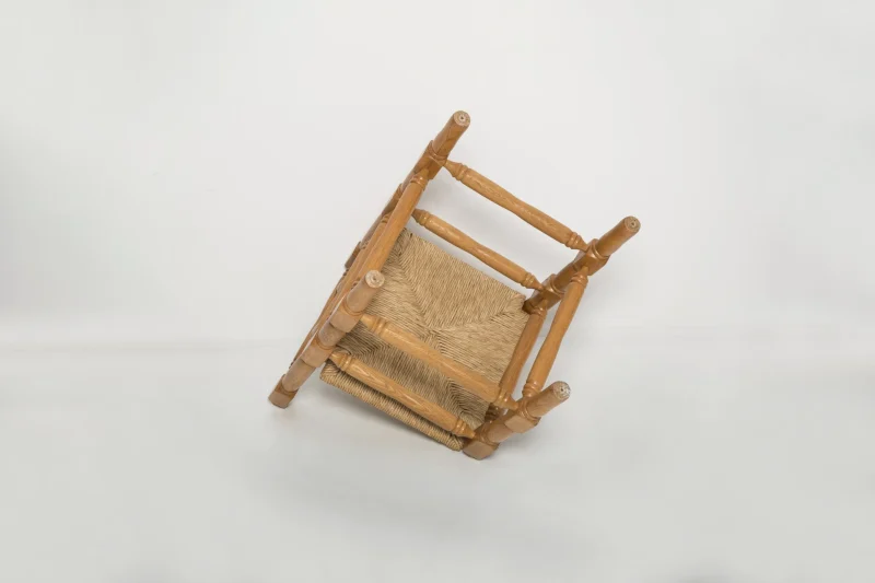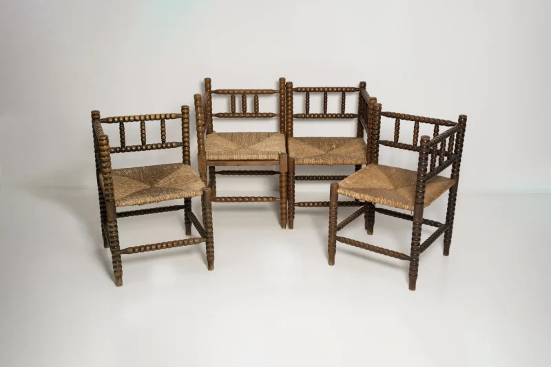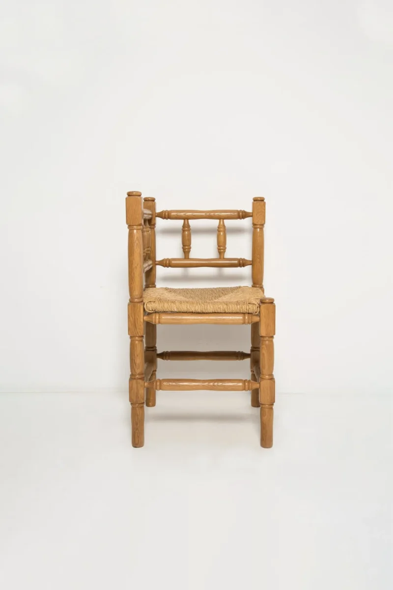 A fine French Provincial corner chair in stained oak with a handmade cane seat. Classic bobbin turned legs and in a overall fine vintage condition. Made in the 19th century. Lovely handmade chair that will complement many interior styles. A modern, classic or an Art Deco home decor. We have a few similar chairs. Check the last picture please.