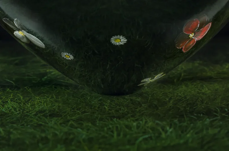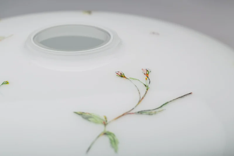 Mouth-blown unique vase using opaque white opal czech crystal glass, with a story of wildflowers.