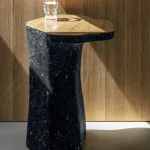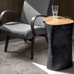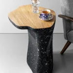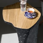 The base mimics the look and feel of concrete while remaining lightweight and durable. The oak tabletop adds a natural touch of elegance, creating a perfect harmony between organic form and modern design.