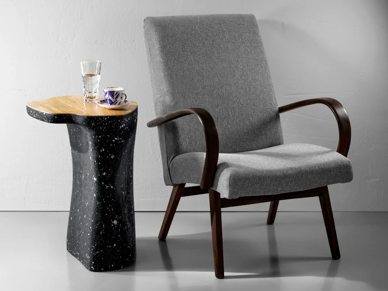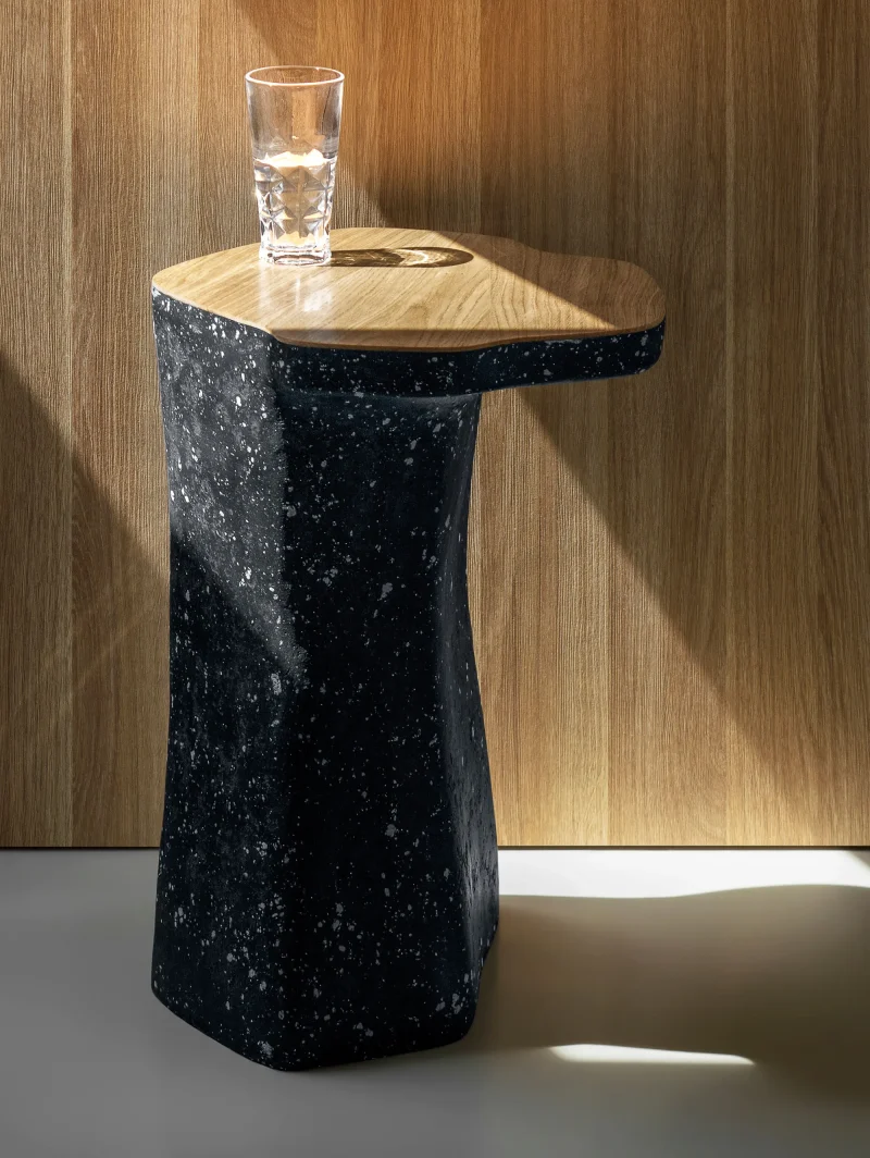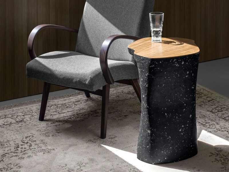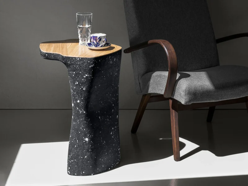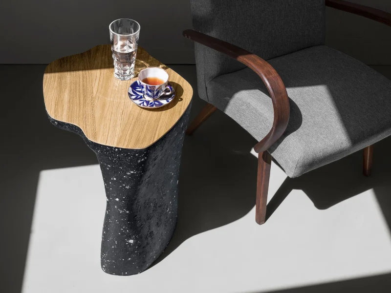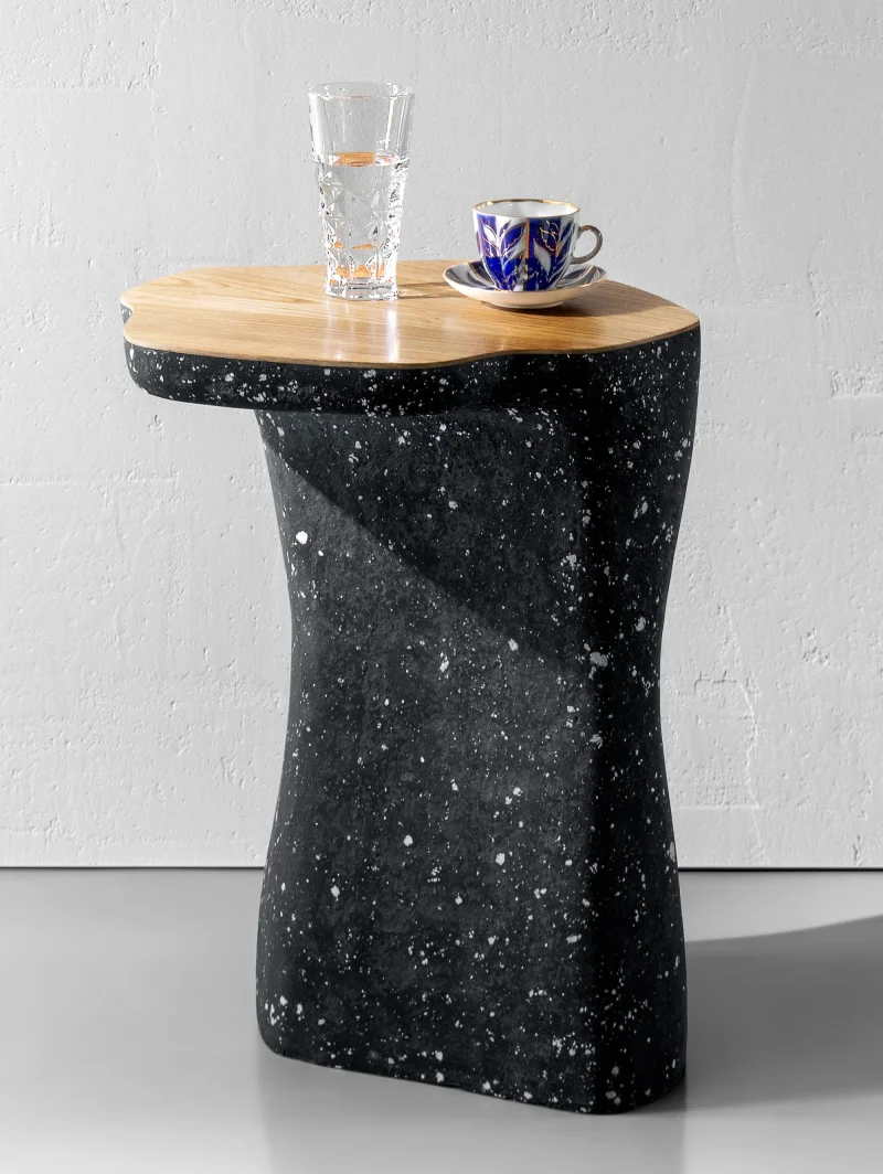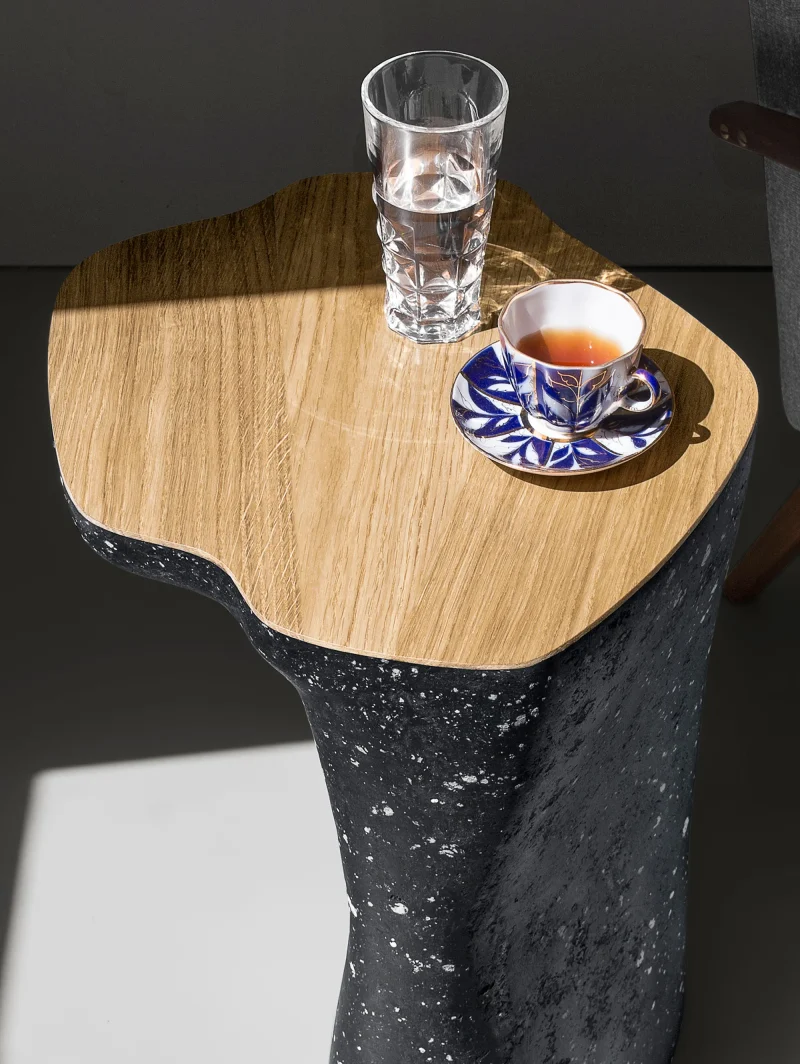 The base mimics the look and feel of concrete while remaining lightweight and durable. The oak tabletop adds a natural touch of elegance, creating a perfect harmony between organic form and modern design.