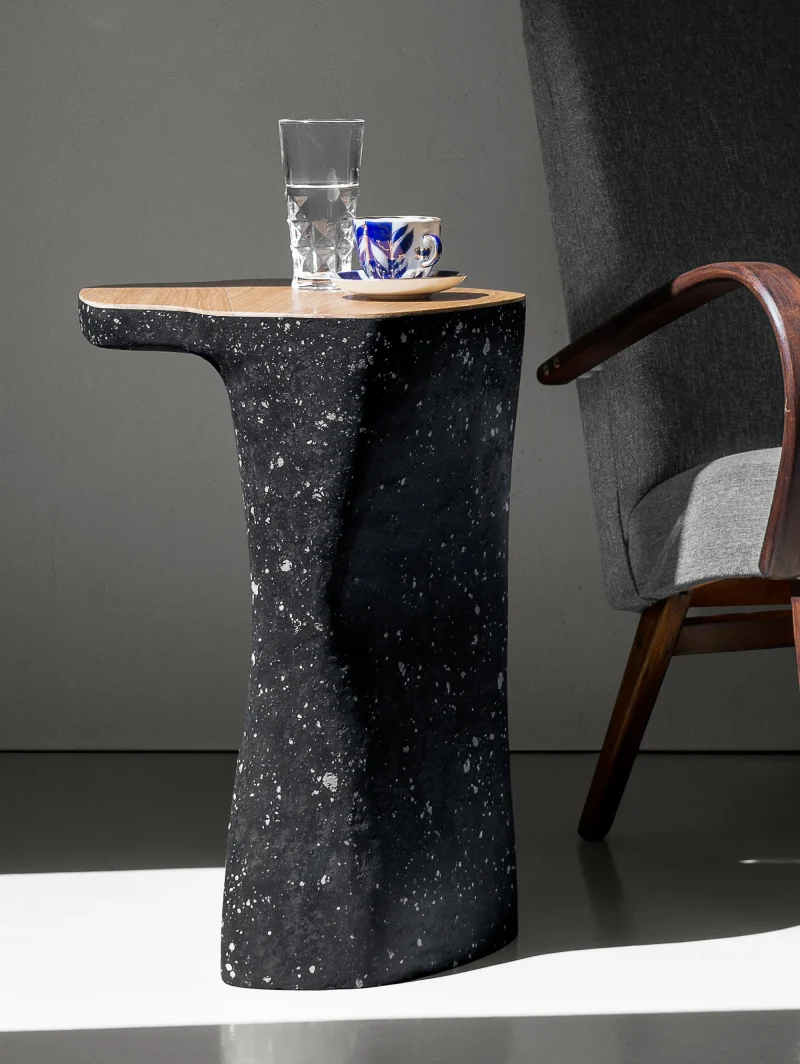 The table features a solid oak top paired with a base made from a custom blend of recycled paper, glue, paint, and filler – creating a sustainable yet visually striking form. Each piece is meticulously shaped by hand, showcasing the contrast between the warmth of wood and the raw texture of the sculptural base.
