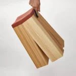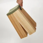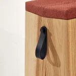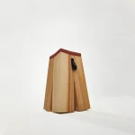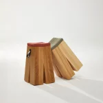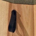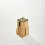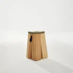 The random constellation of squared timbers leaning against each other at an angle reminds the designer of the tower with the steepest incline in the world, Capital Gate in Abu Dhabi, by RMJM Architects and ADNEC, Abu Dhabi National Exhibition Centre. HAPPENS upholstered stool is the result of playing with the concept of inclined towers. 4 slanted, skilfully balanced stool legs create a stable seat on the hand-sewn fabric upholstery. The weighty stool sculpture Can easily be carried through life by the leather handle firmly anchored in the solid wood.