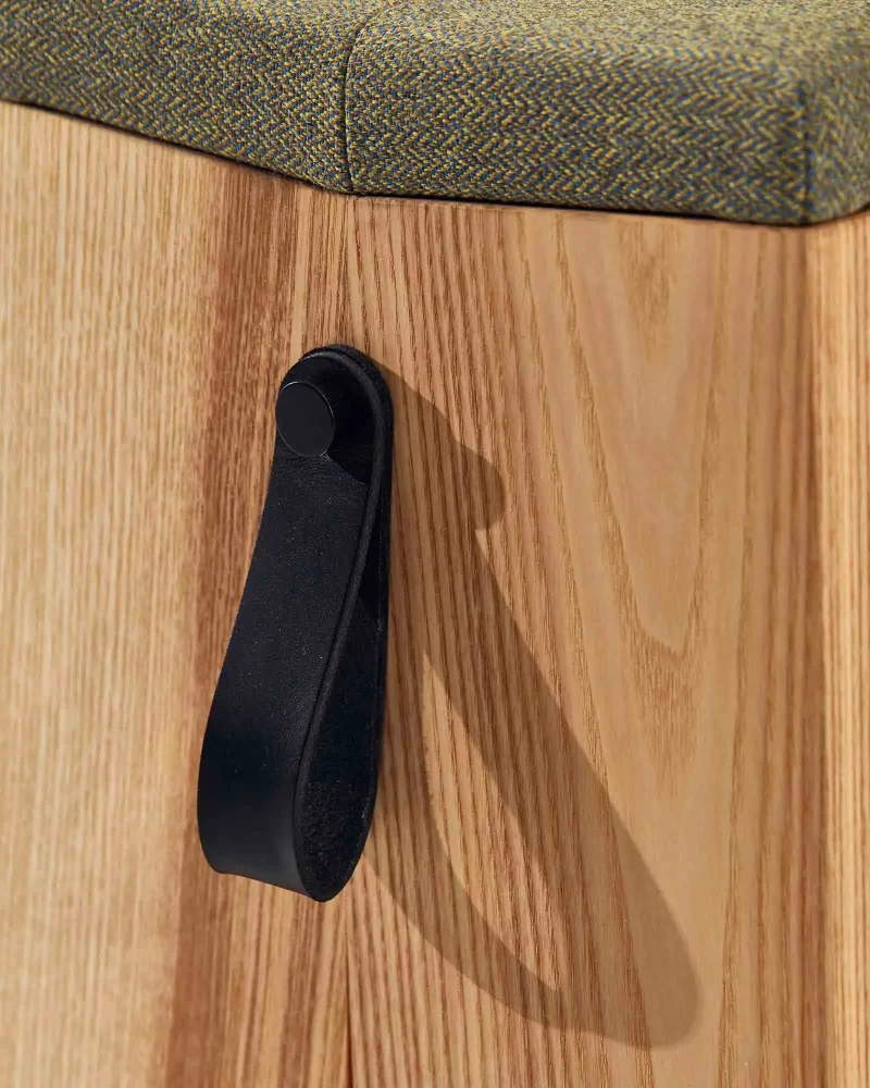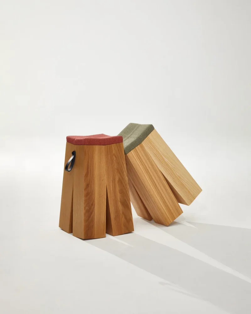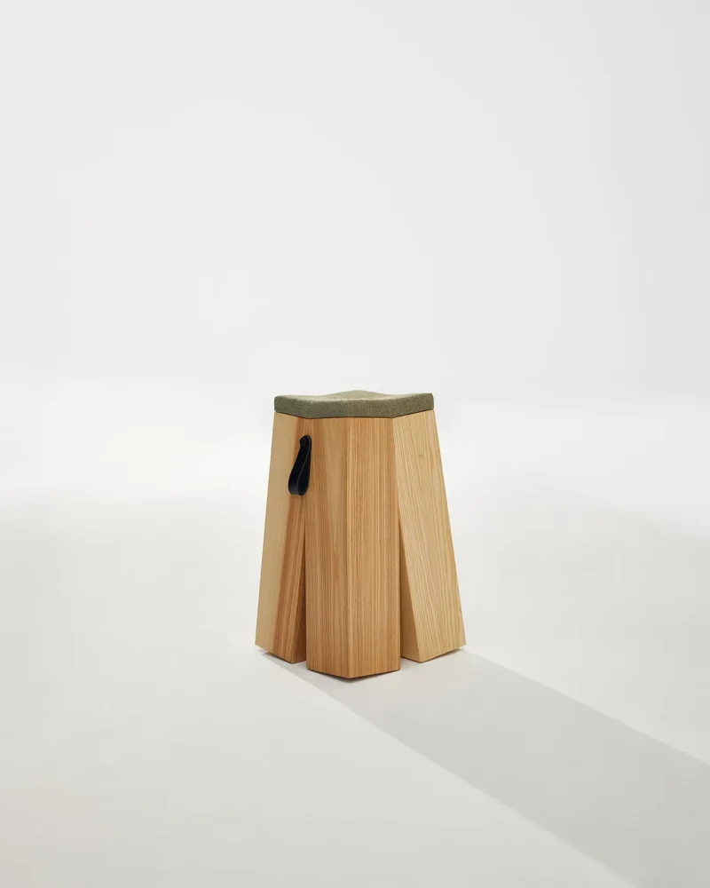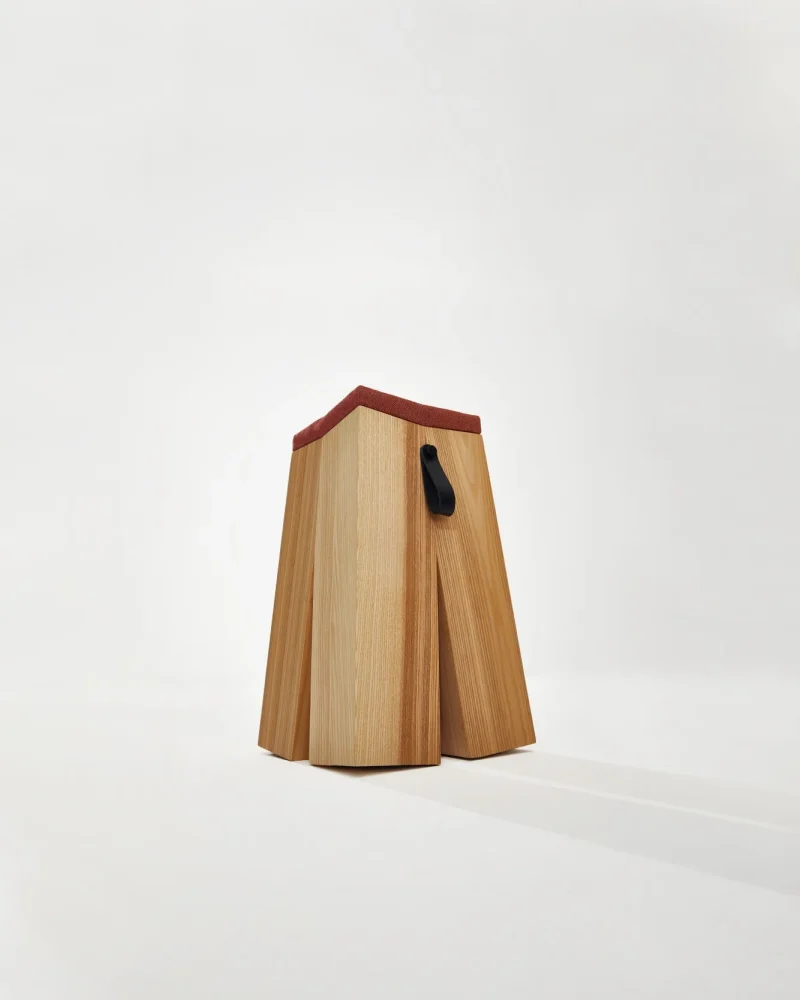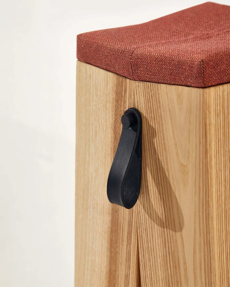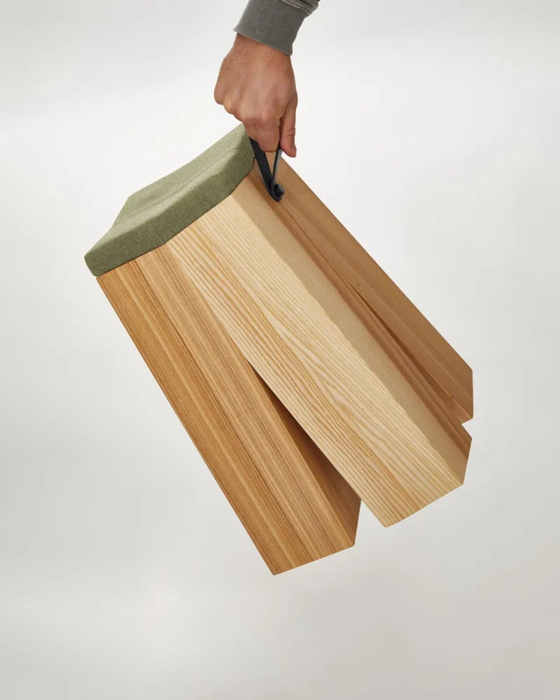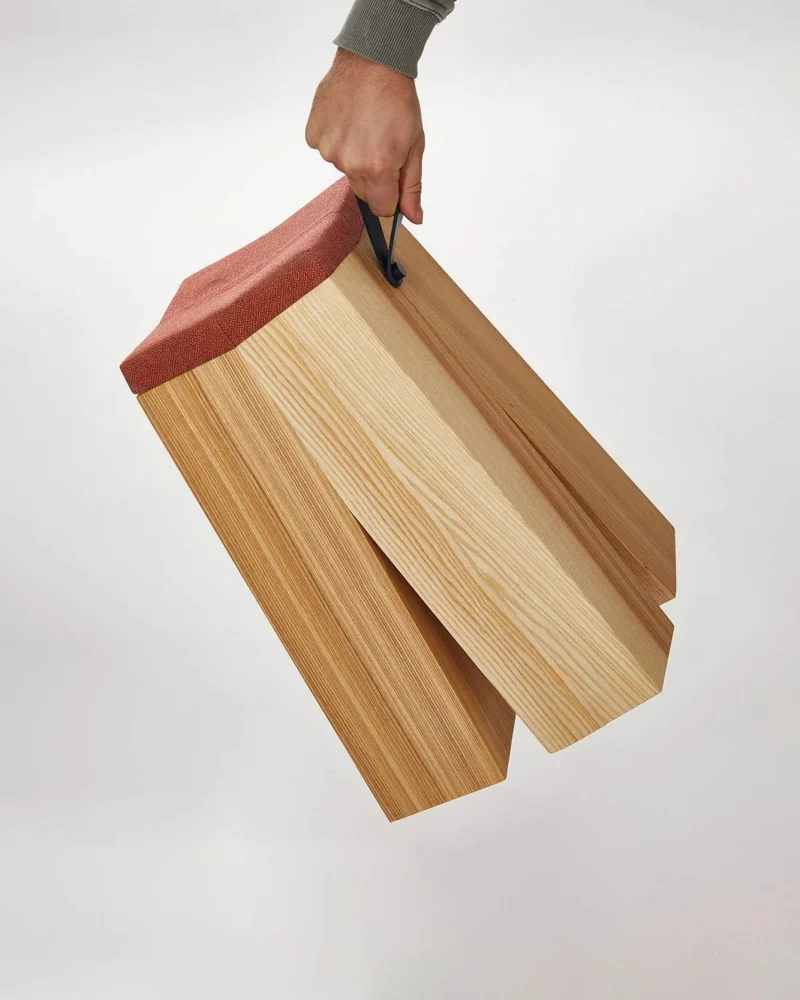 The random constellation of squared timbers leaning against each other at an angle reminds the designer of the tower with the steepest incline in the world, Capital Gate in Abu Dhabi, by RMJM Architects and ADNEC, Abu Dhabi National Exhibition Centre. HAPPENS upholstered stool is the result of playing with the concept of inclined towers. 4 slanted, skilfully balanced stool legs create a stable seat on the hand-sewn fabric upholstery. The weighty stool sculpture Can easily be carried through life by the leather handle firmly anchored in the solid wood.