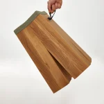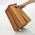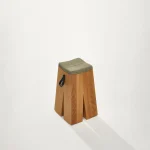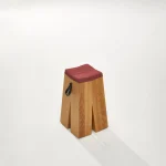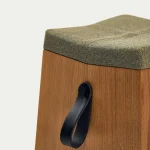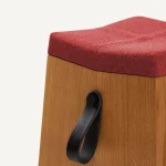 The random constellation of squared timbers leaning against each other at an angle reminds the designer of the tower with the steepest incline in the world, Capital Gate in Abu Dhabi, by RMJM Architects and ADNEC, Abu Dhabi National Exhibition Centre. HAPPENS upholstered stool is the result of playing with the concept of inclined towers. 4 slanted, skilfully balanced stool legs create a stable seat on the hand-sewn fabric upholstery. The weighty stool sculpture Can easily be carried through life by the leather handle firmly anchored in the solid wood.